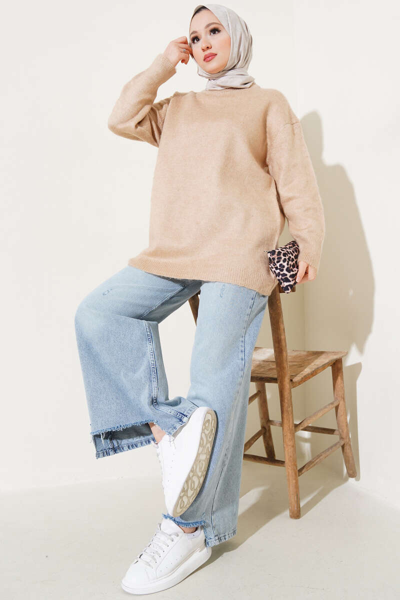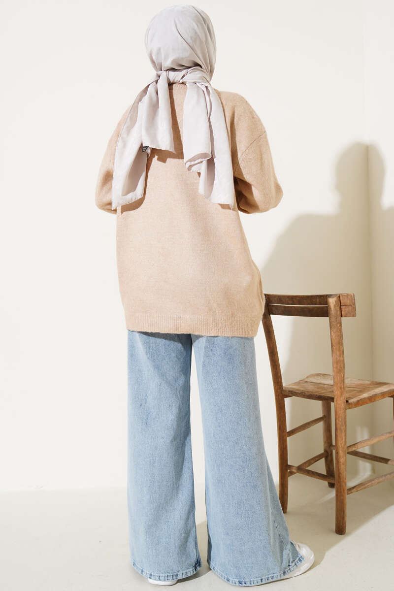 Bisiklet Yaka Düz Triko Tunik Latte