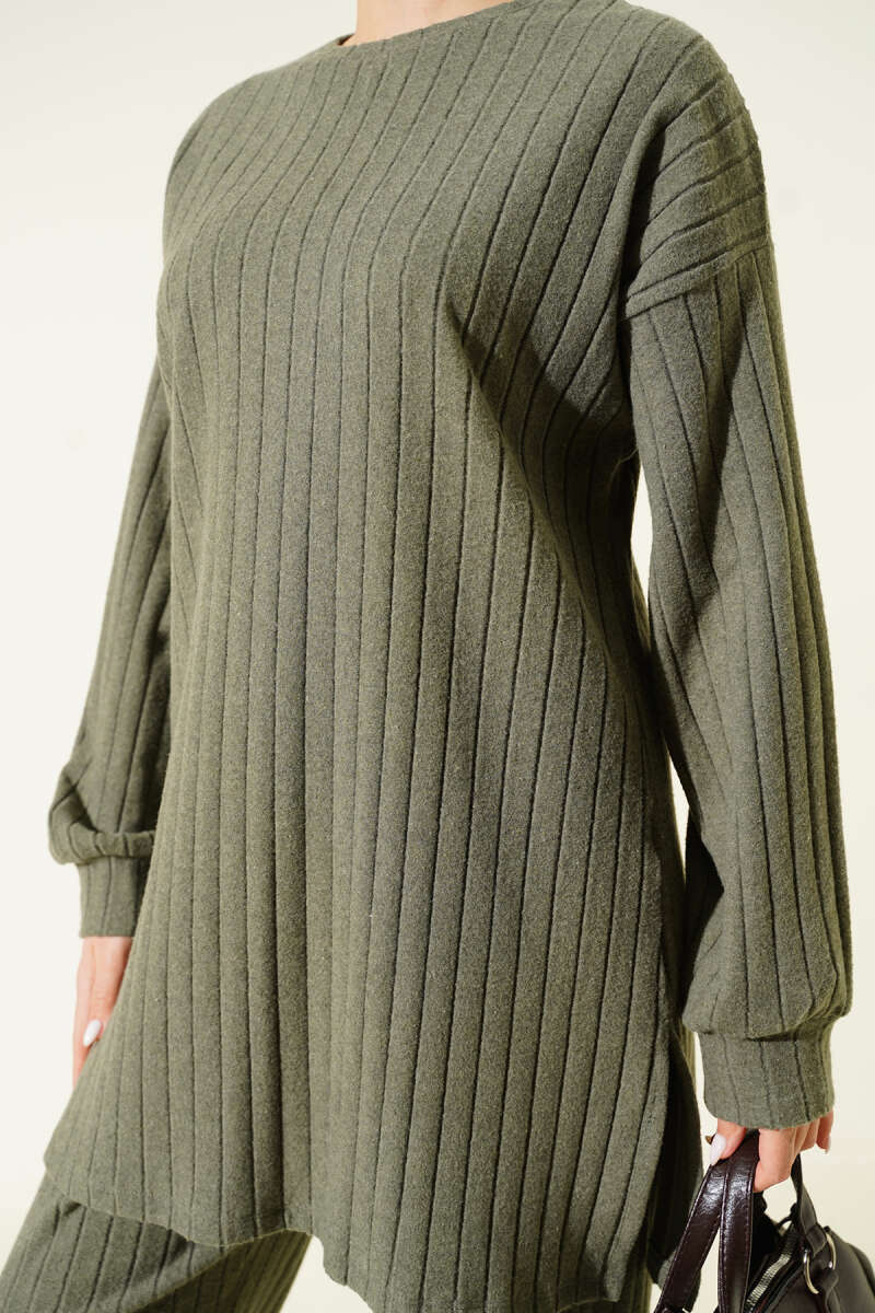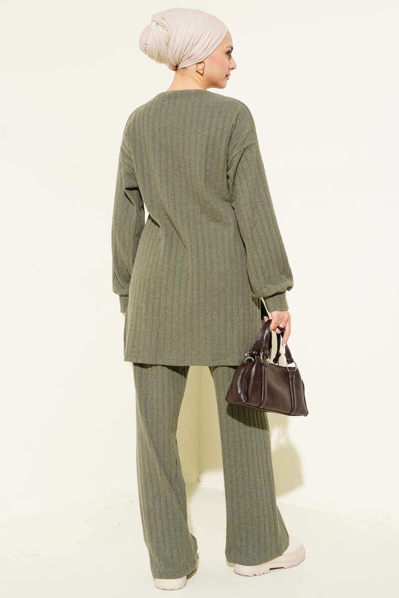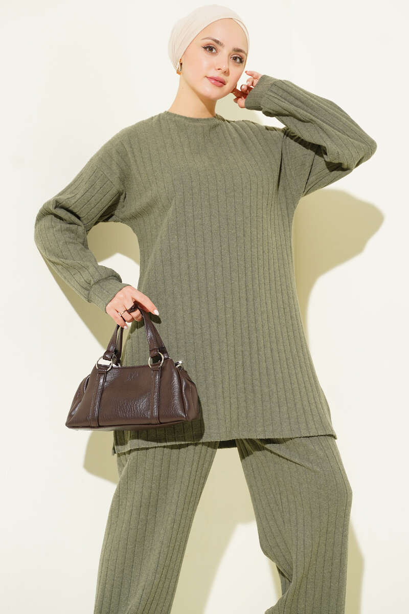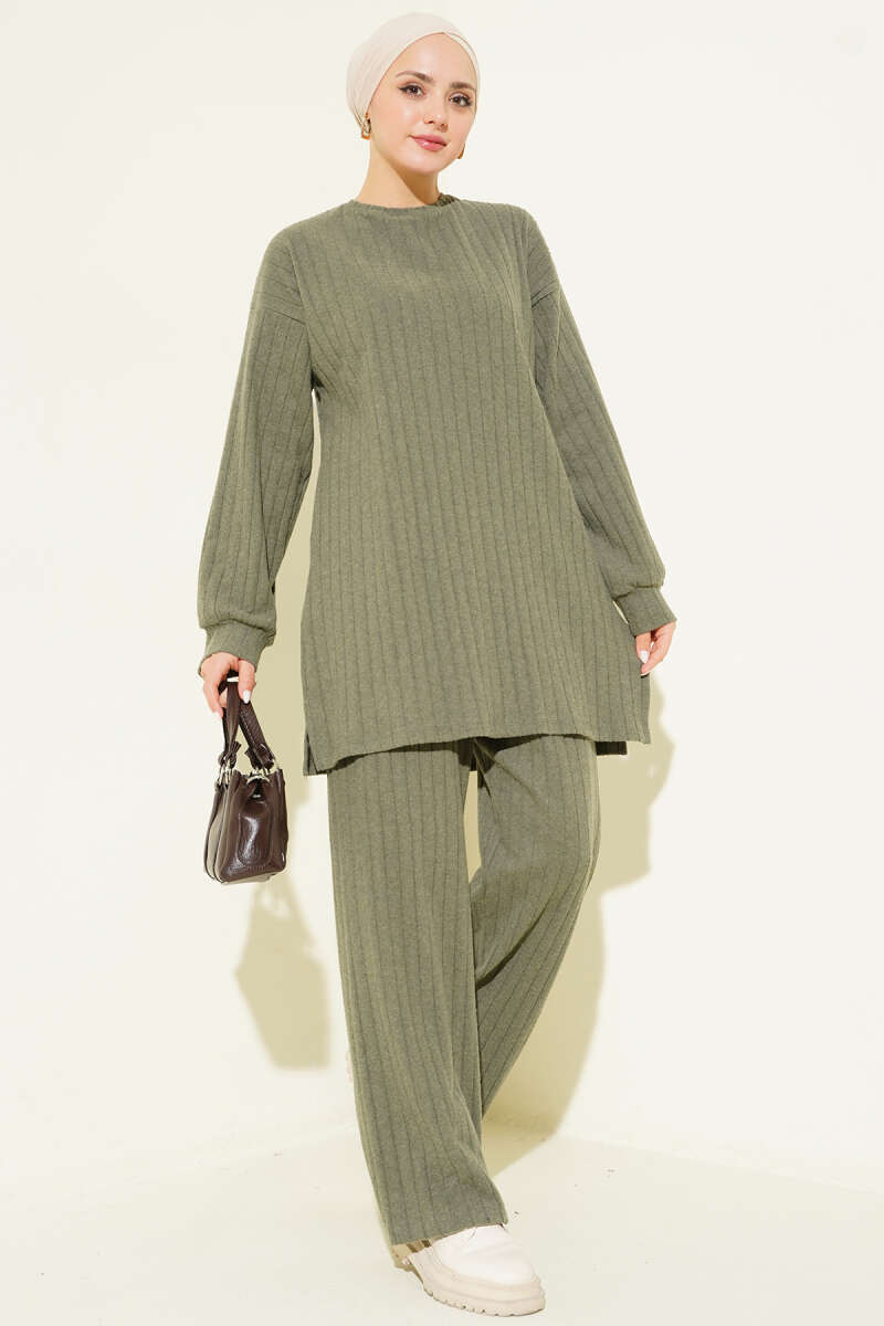 Bisiklet Yaka Fitilli Triko İkili Takım Latte