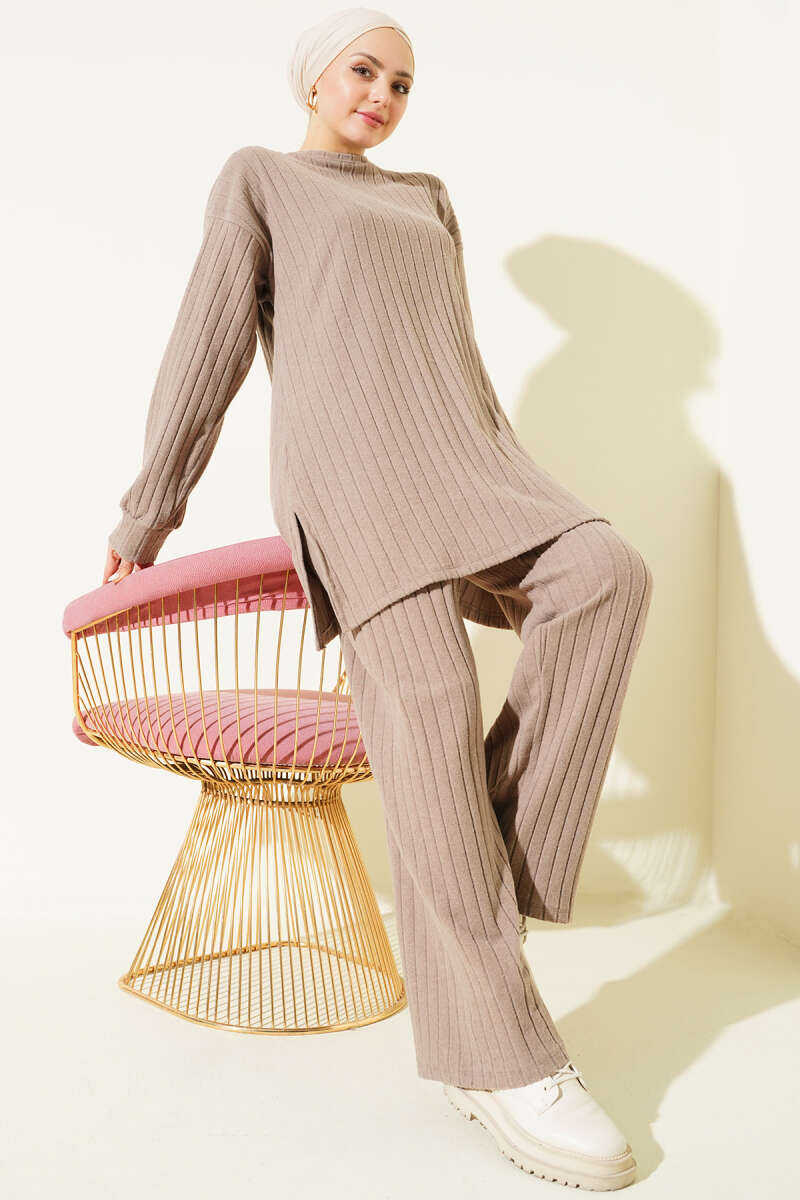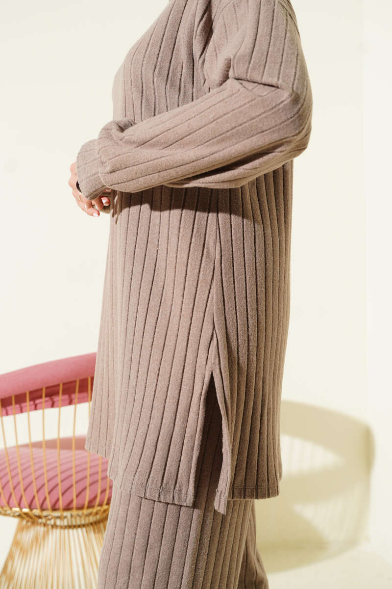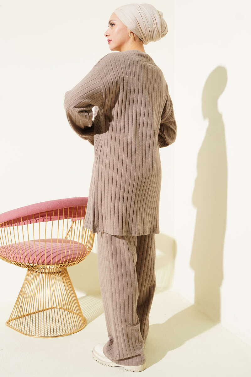 Bisiklet Yaka Fitilli Triko İkili Takım Kahve