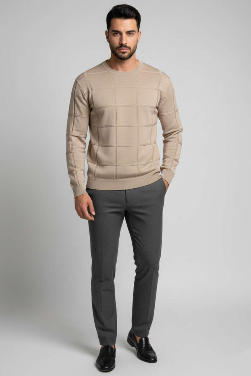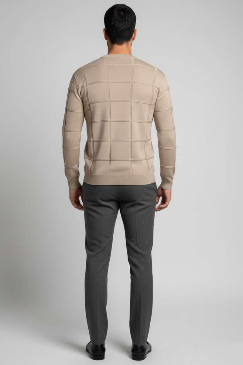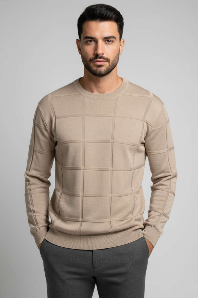 Bisiklet Yaka Kare Desenli Erkek Triko Kazak Kahve