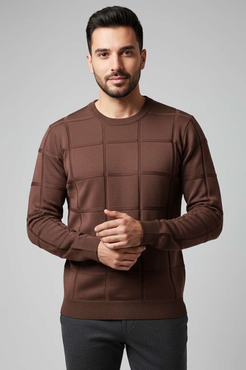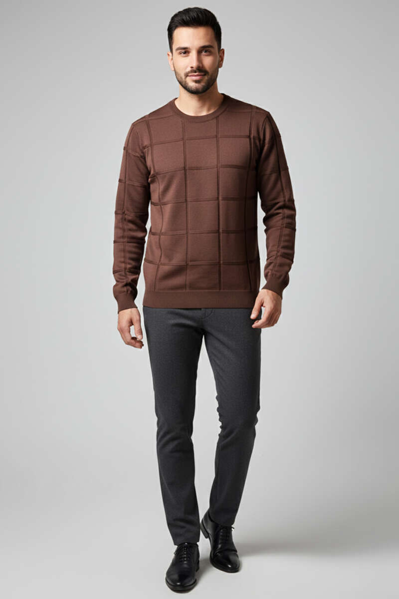 Bisiklet Yaka Kare Desenli Erkek Triko Kazak Bej