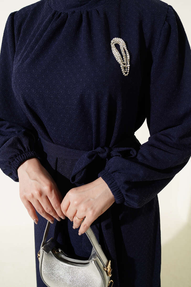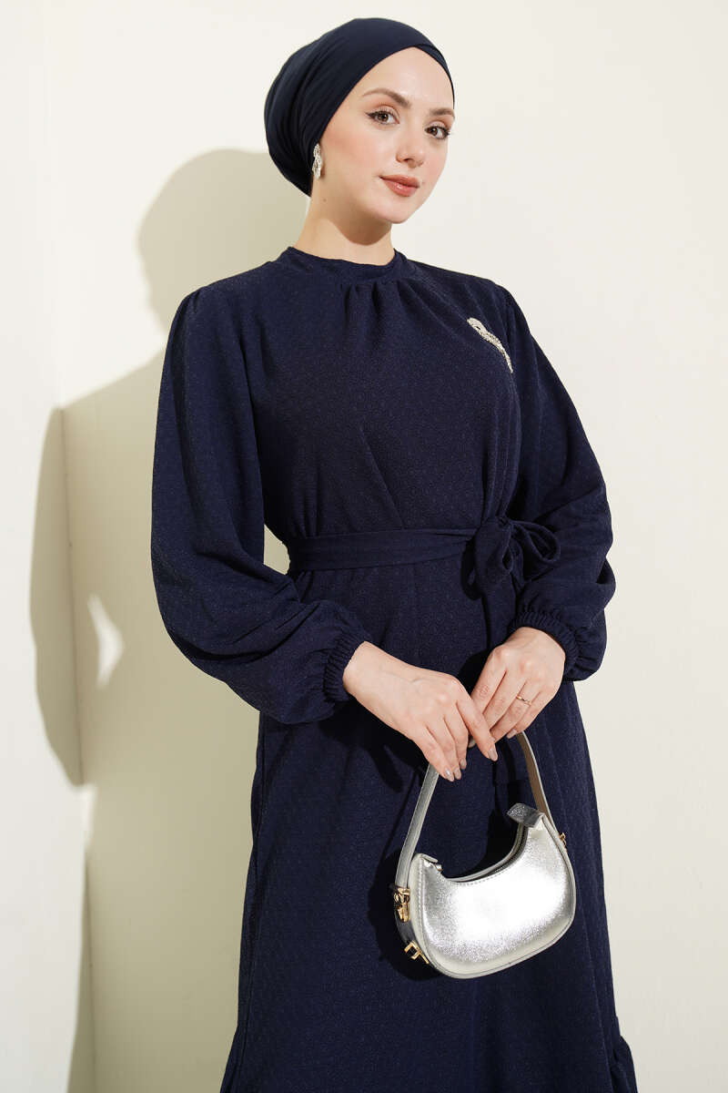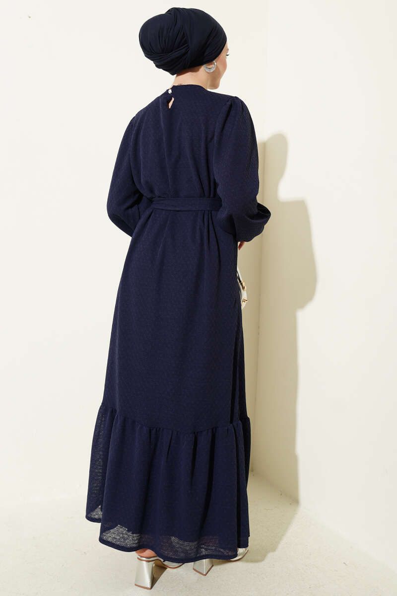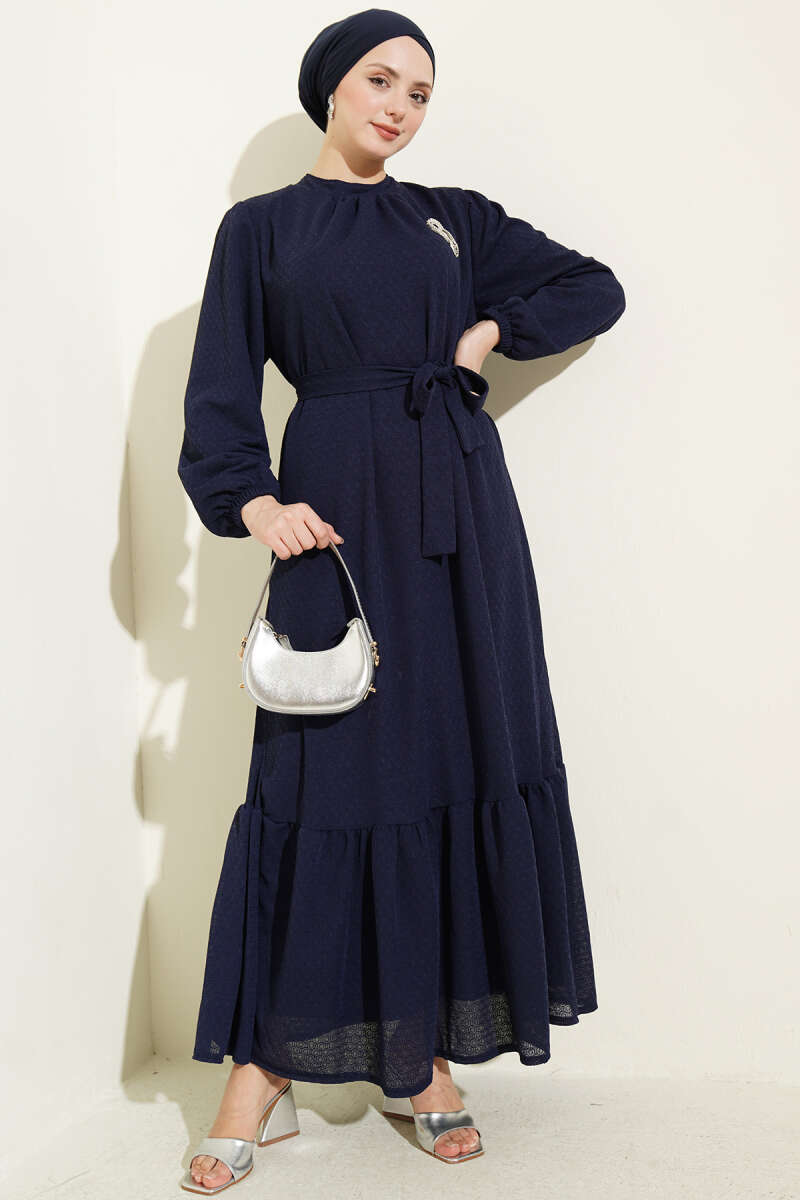 Kendinden desenli dokusuyla şıklığı ve konforu bir arada sunuyor. Bel kısmındaki ayarlanabilir kuşak detayı silüetinizi zarifçe vurgularken, etek ucundaki geniş volan tasarımı her adımda dinamik ve akıcı bir duruş sergiliyor.