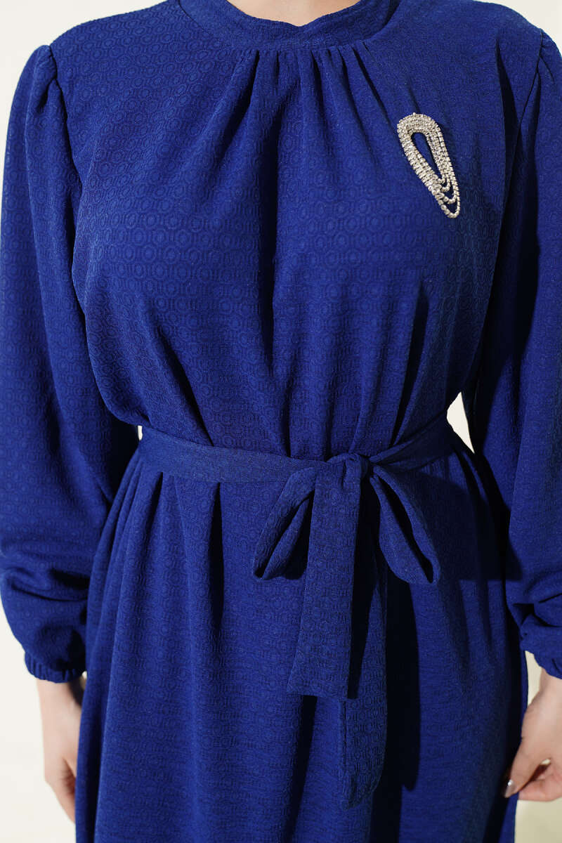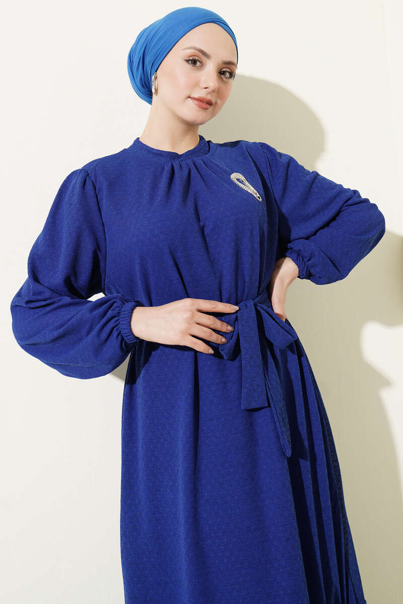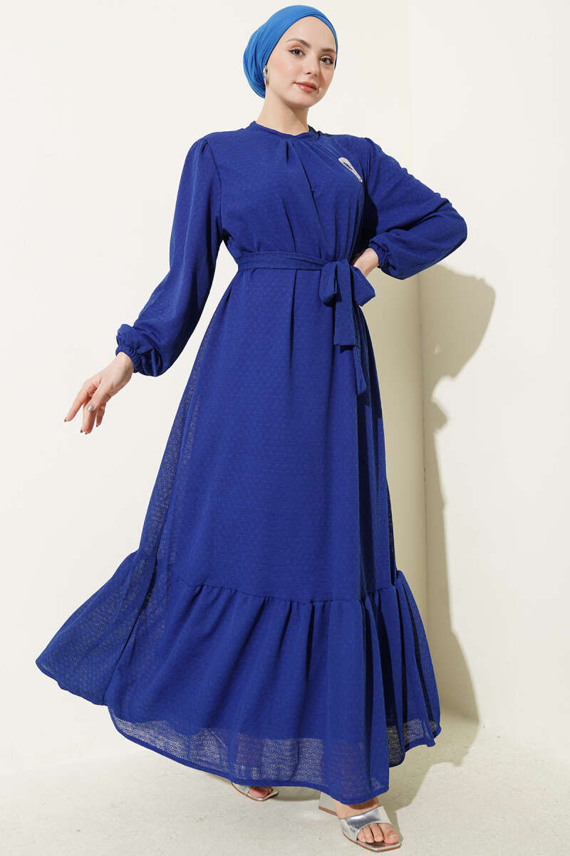 Düğmeli Brode Bilek Lastikli Elbise Mavi
