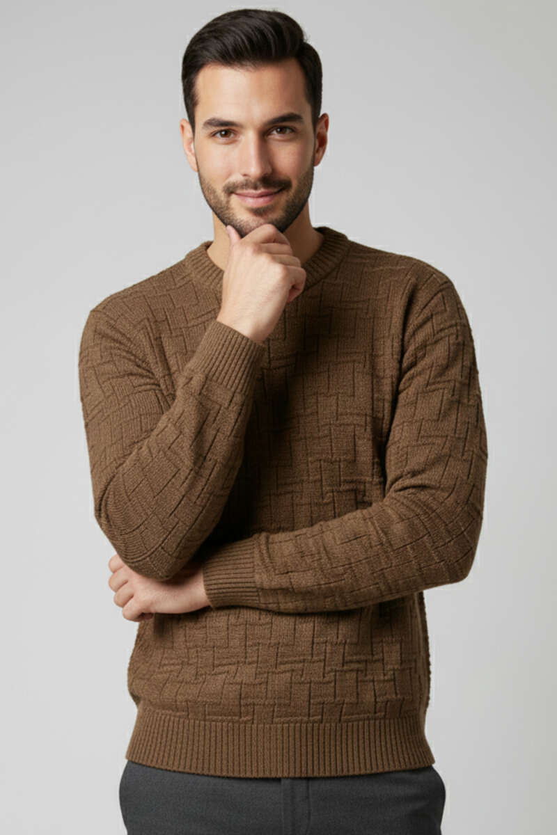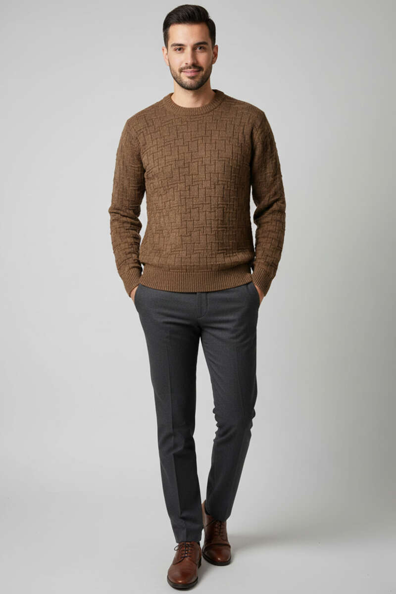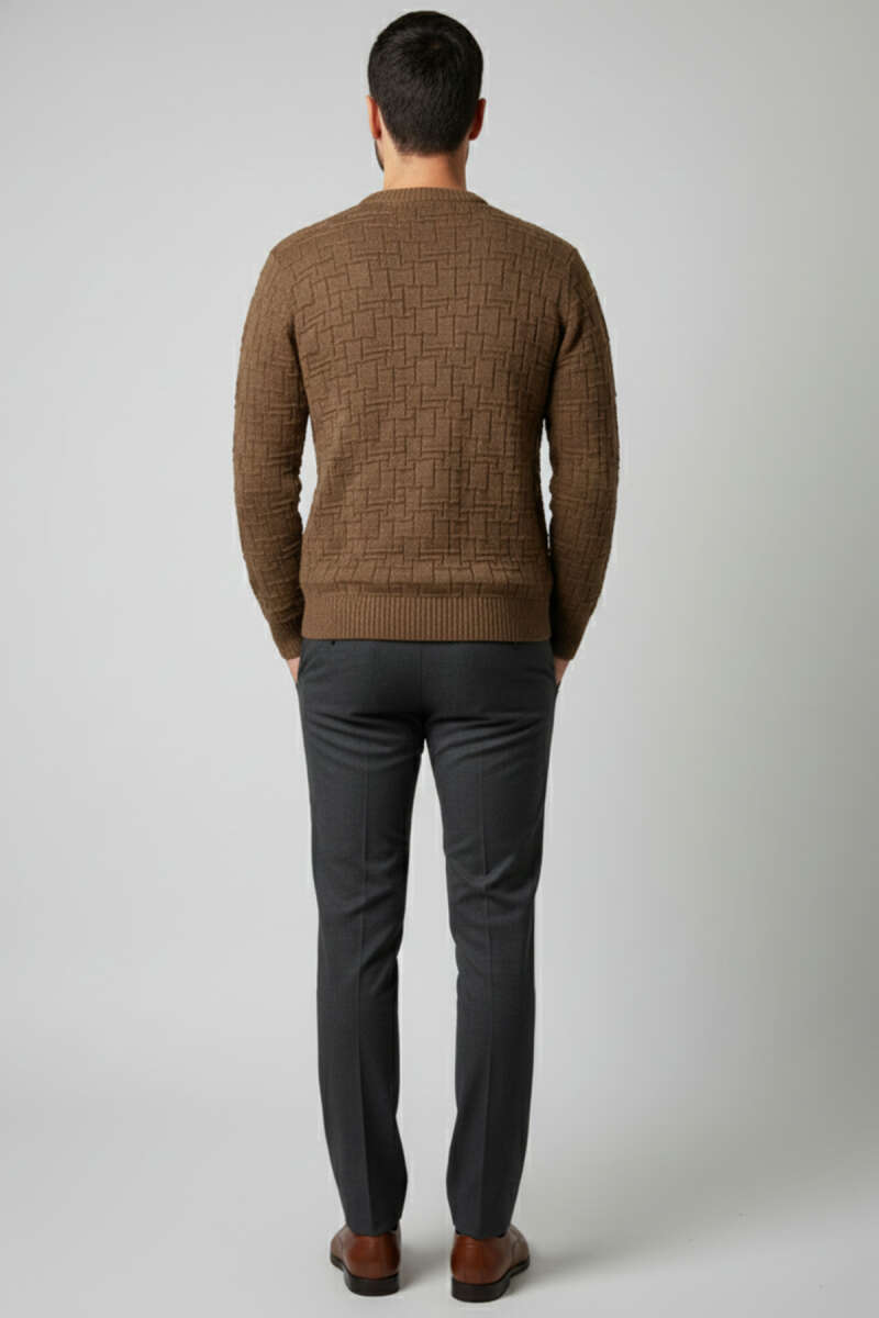 Çizgi Desen Örgü Triko Erkek Kazak Kahve