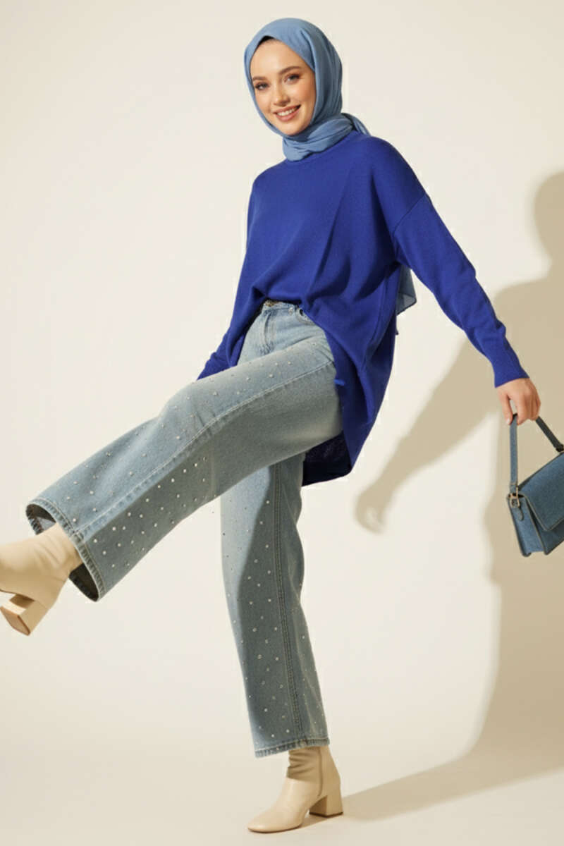 Fitilli Esnek Triko Kazak Beyaz