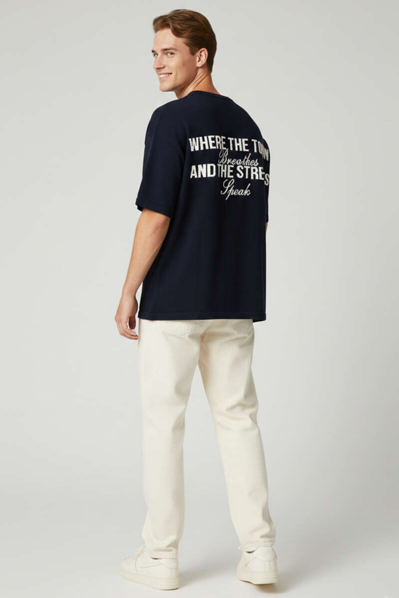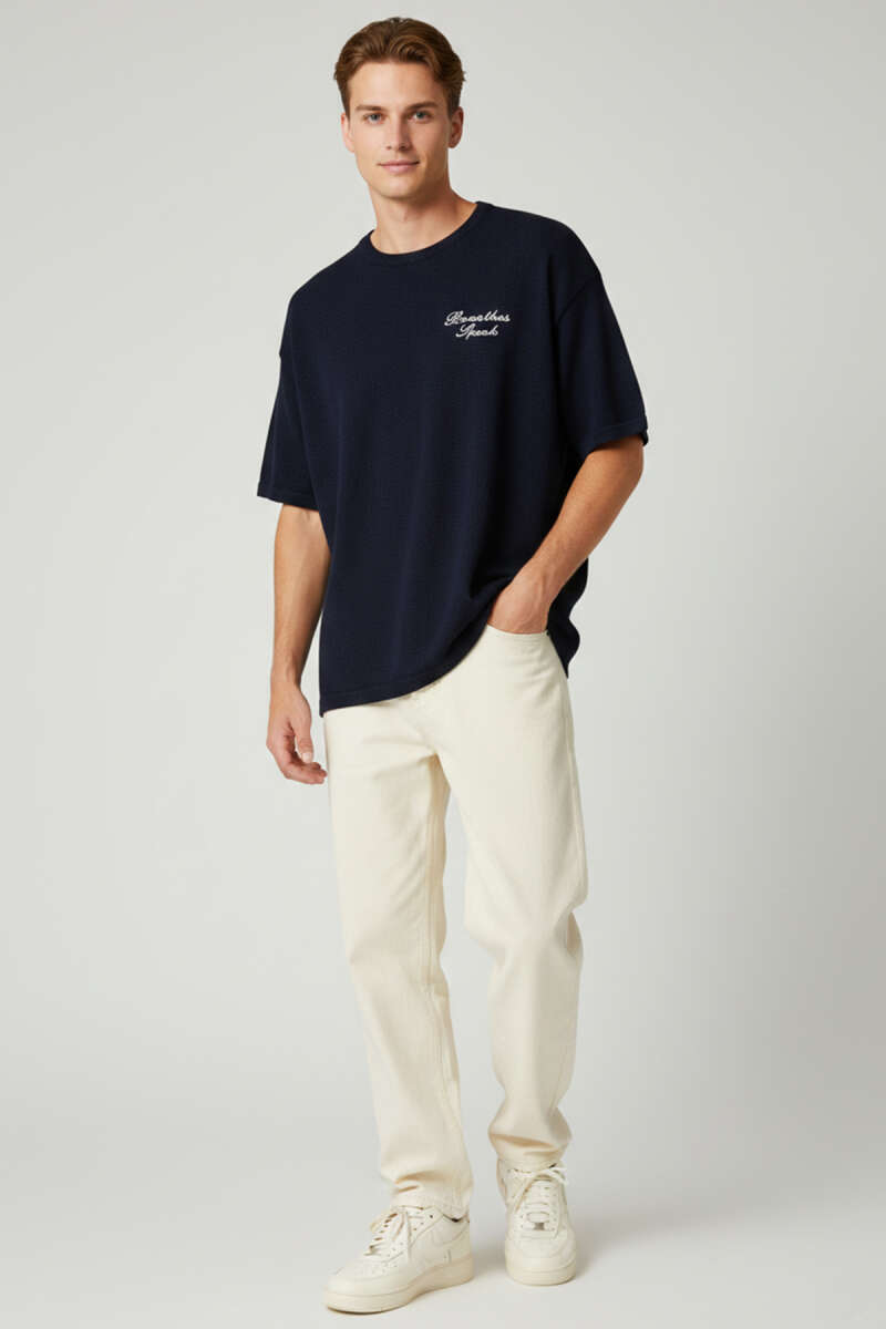 Bisiklet Yaka Nakışlı Örme T-shirt Lacivert