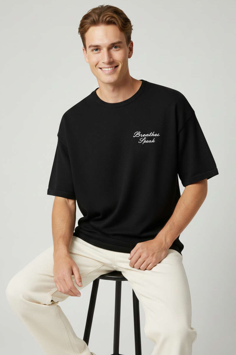 Bisiklet Yaka Nakışlı Örme T-shirt Siyah