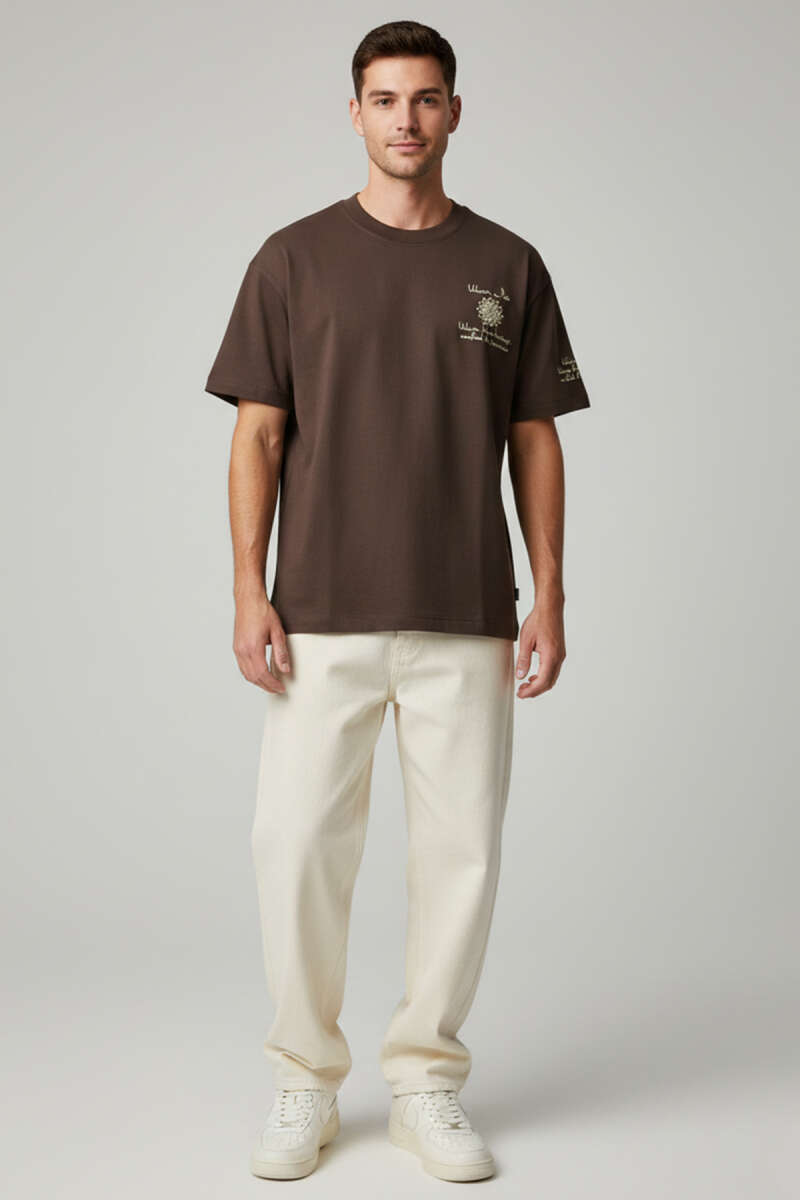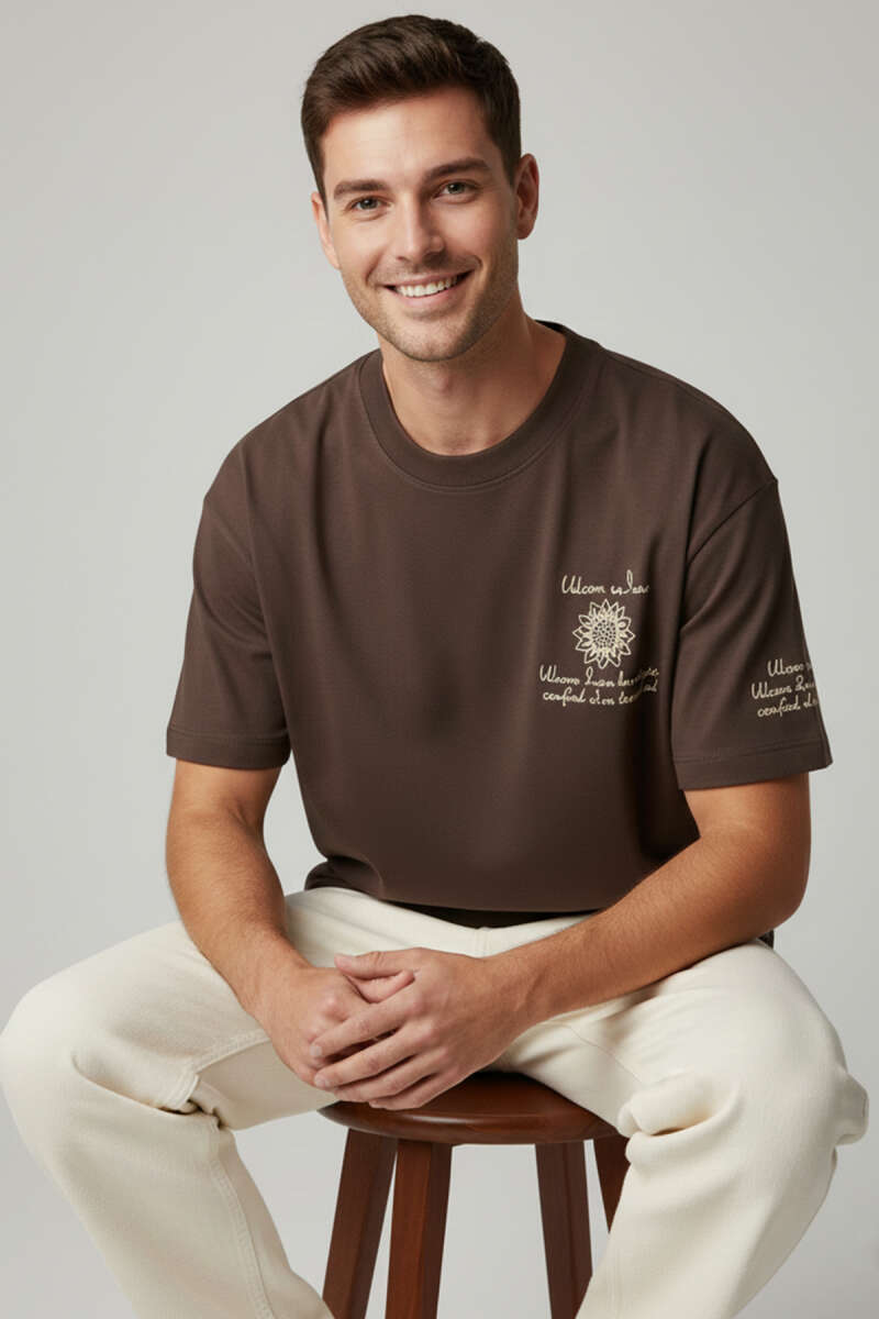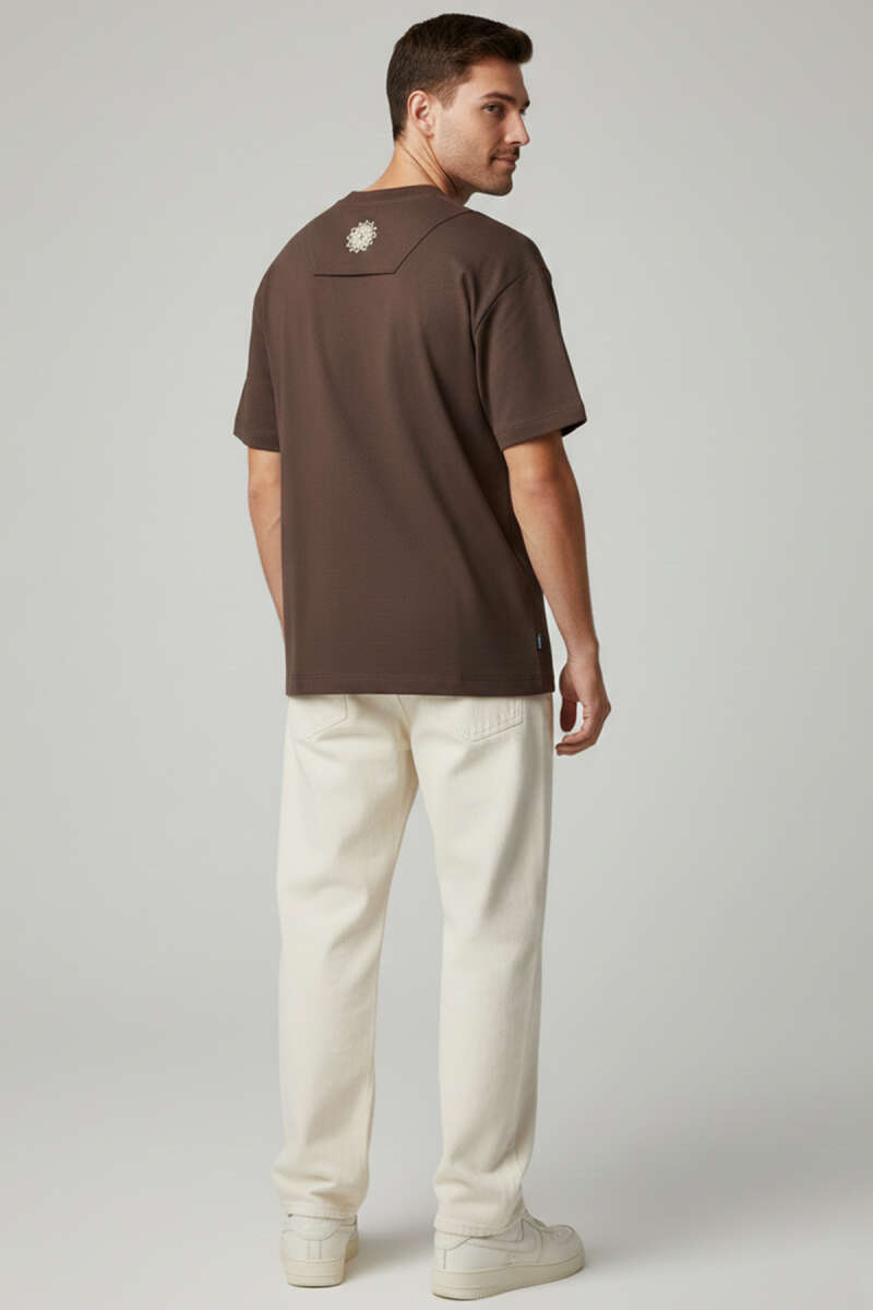 Bisiklet Yaka Nakışlı Oversize T-shirt Acı Kahve