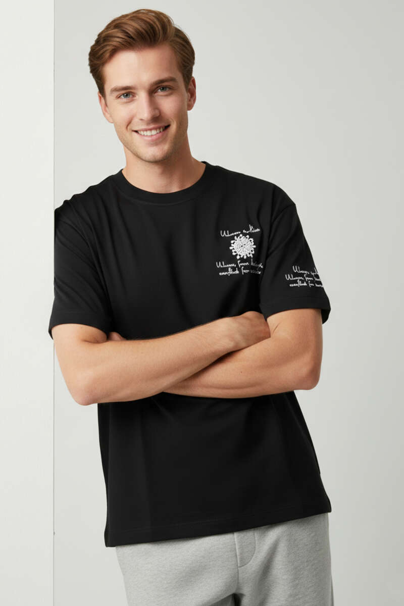 Bisiklet Yaka Nakışlı Oversize T-shirt Siyah