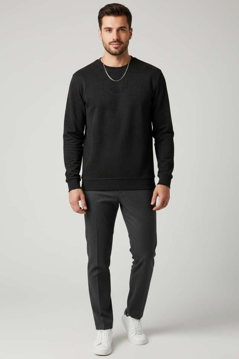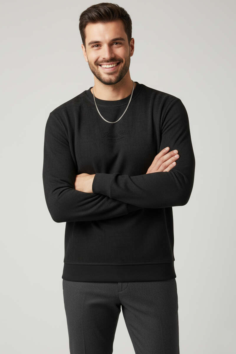 Bisiklet Yaka Süet Erkek Sweatshirt Siyah