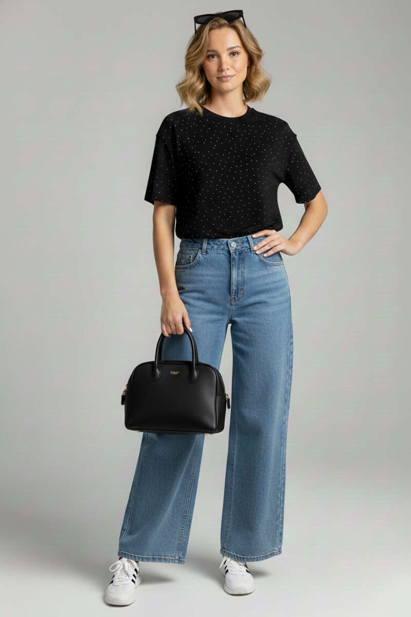 Bisiklet Yaka Taşlı T-shirt Siyah