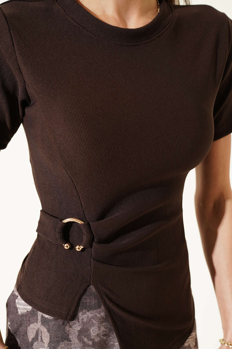 Bisiklet Yaka Tokalı Fitilli Bluz Kahve