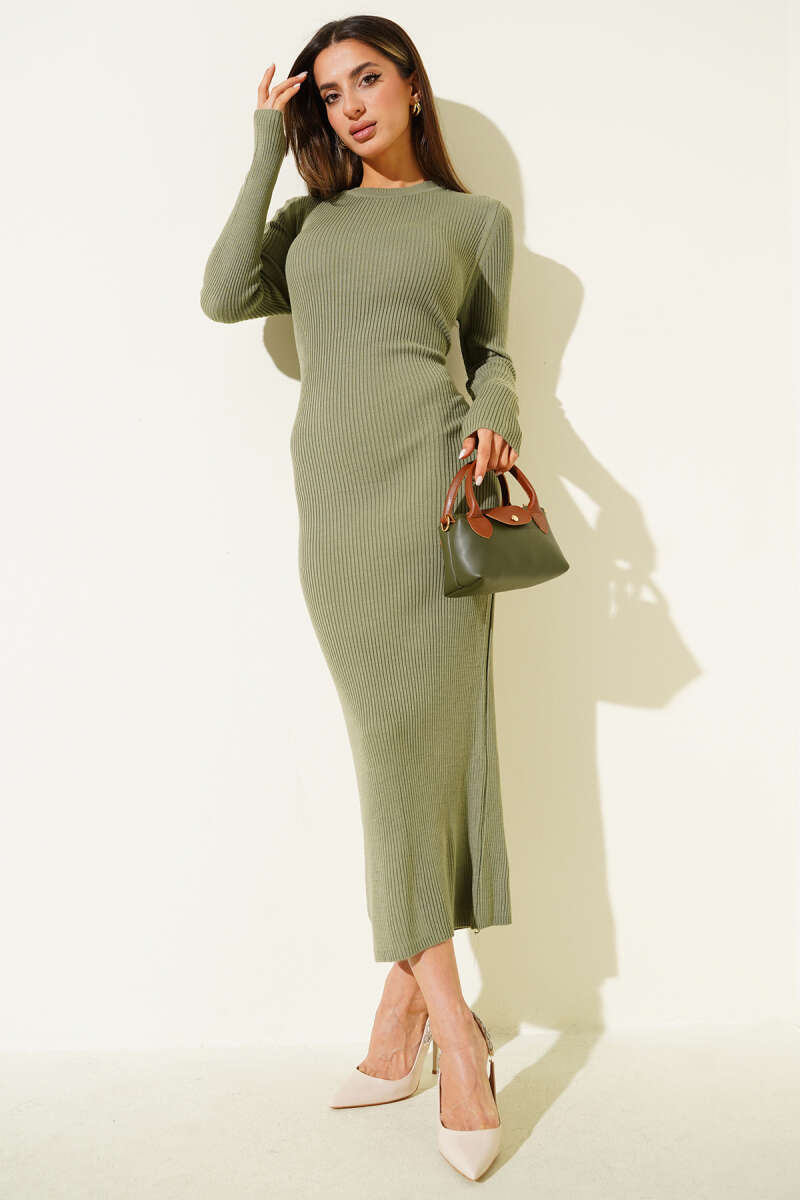 Önü Bağlamalı Yarım Düğmeli Tencel Elbise Haki
