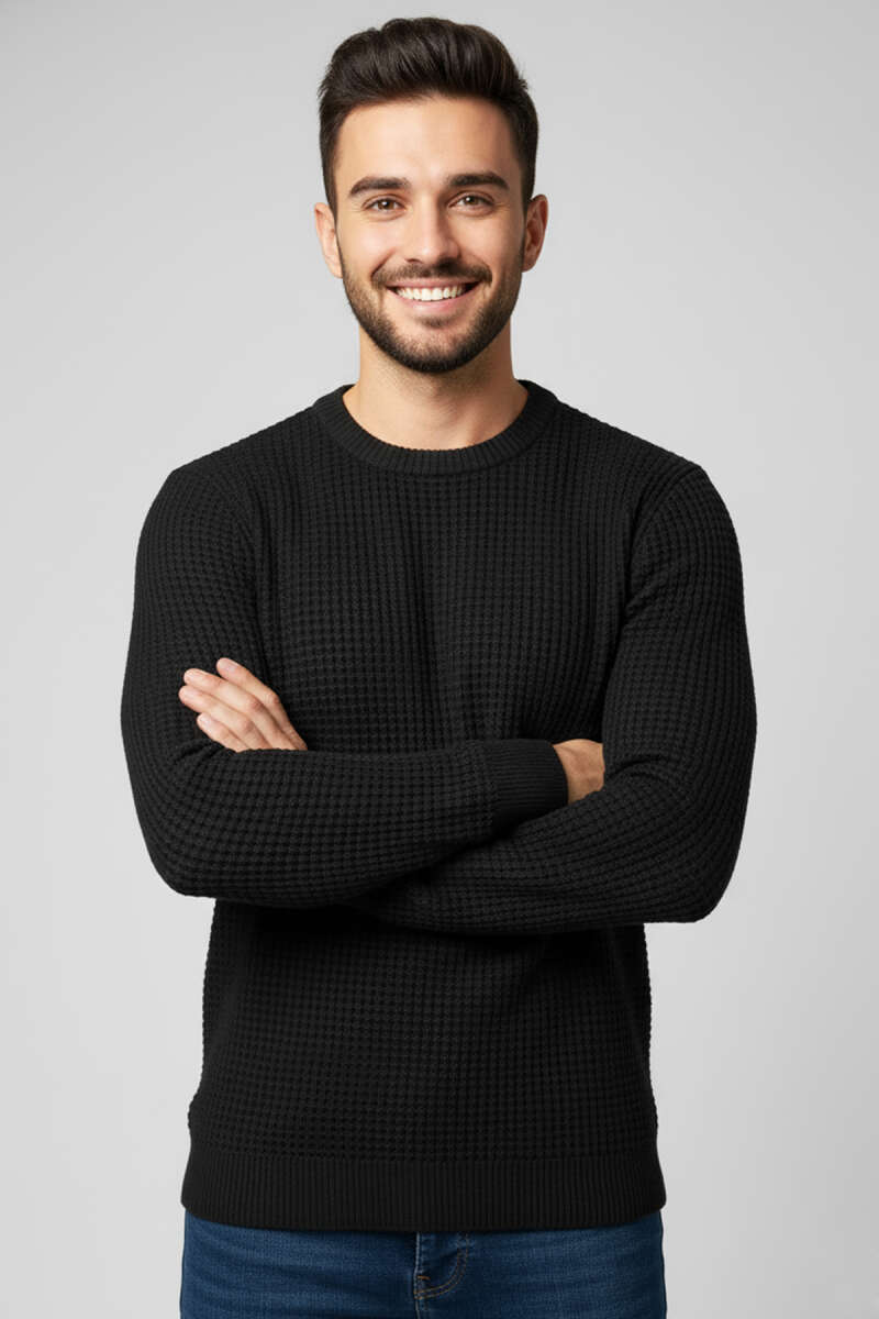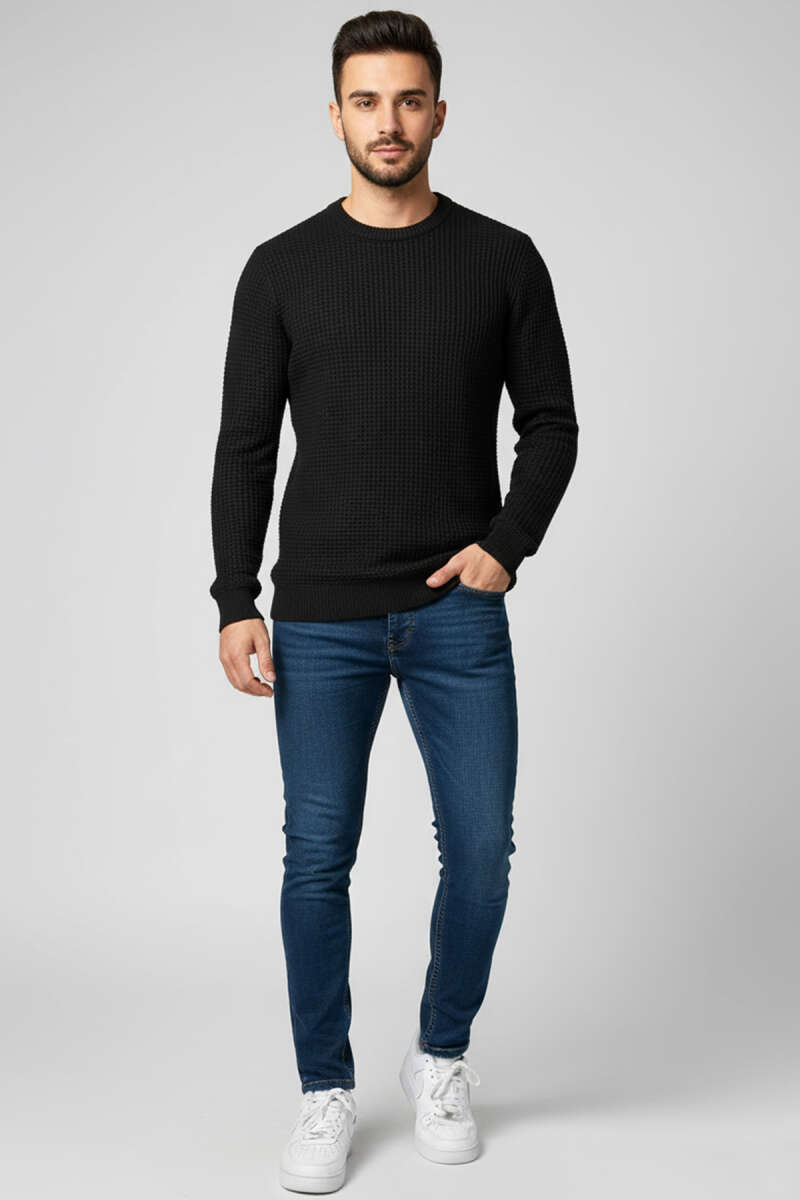 Bisiklet Yaka Waffle Erkek Triko Kazak Siyah