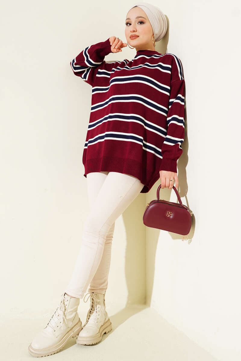 Yatay Çizgili Fitilli Triko Tunik Bej