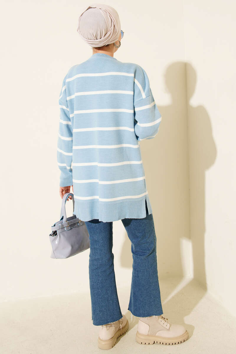 Yatay Çizgili Düşük Omuz Triko Tunik Mavi