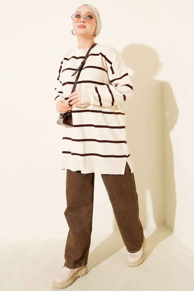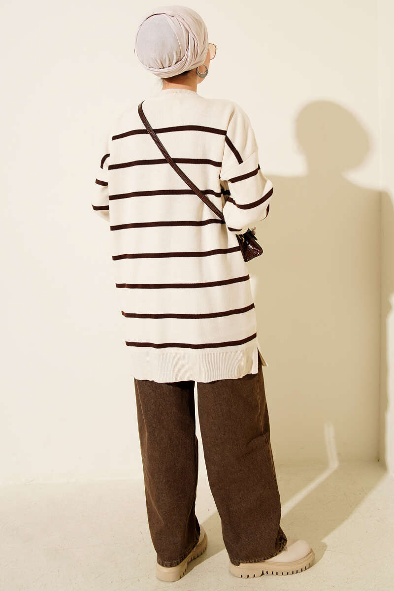 Yatay Çizgili Düşük Omuz Triko Tunik Kahve