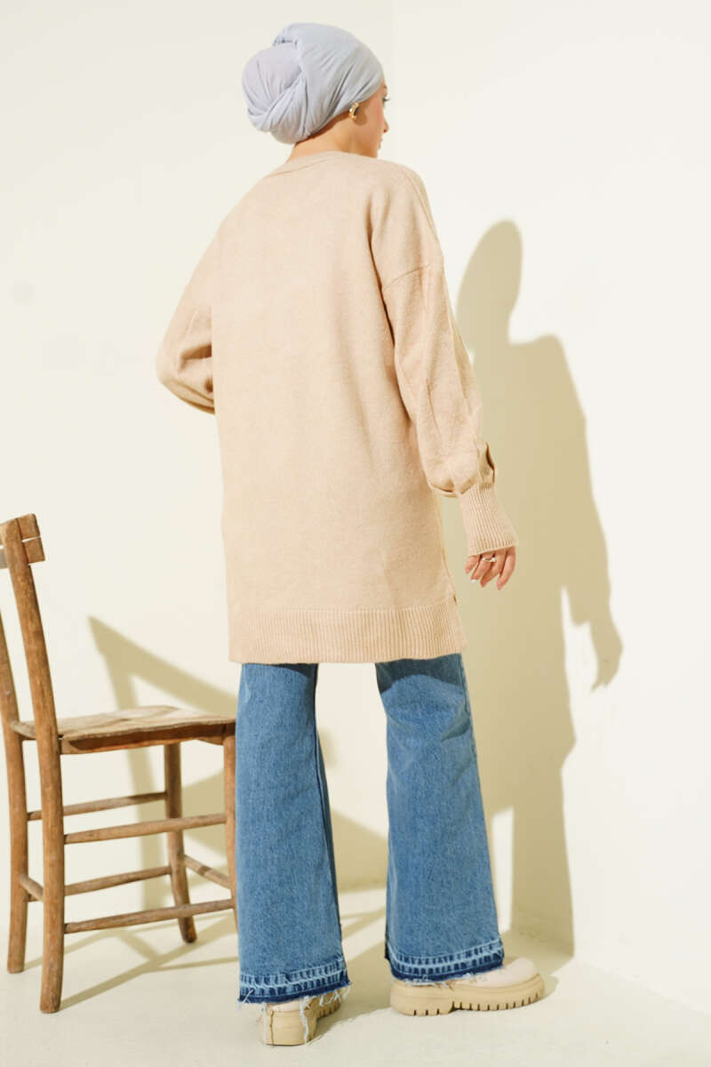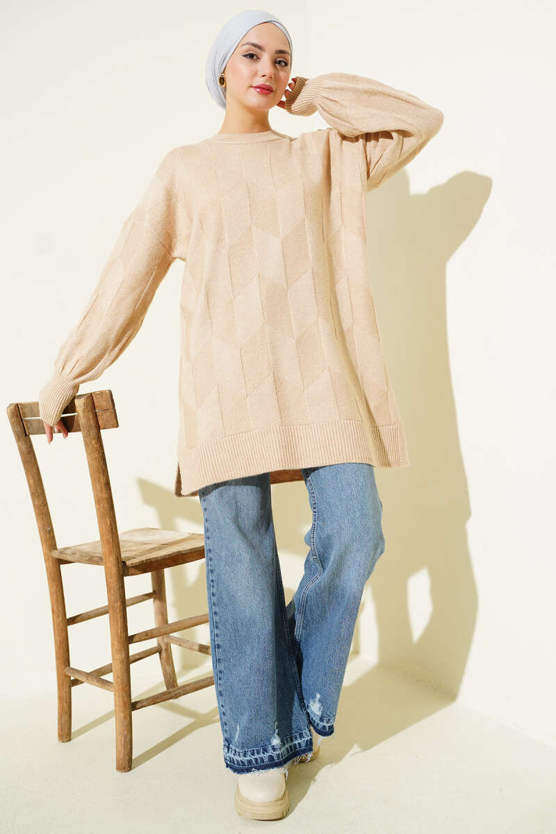 Bisiklet Yaka Yumoş Yan Yırtmaçlı Triko Tunik Vizon