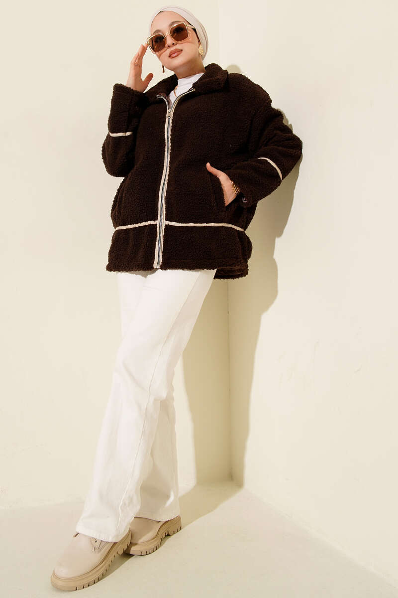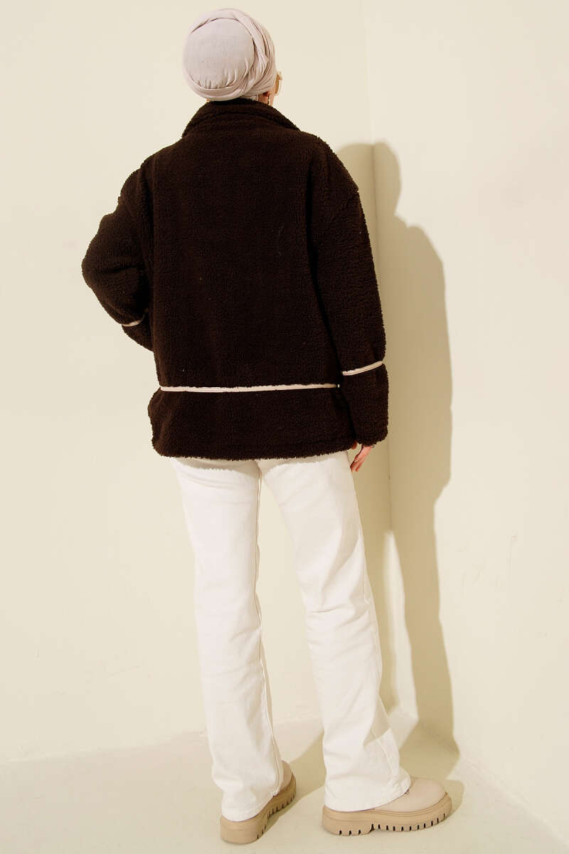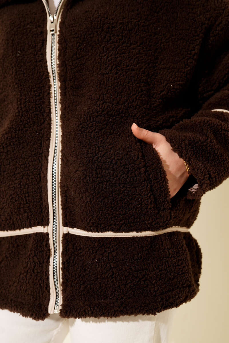 Biye Şeritli Peluş Mont Kahve