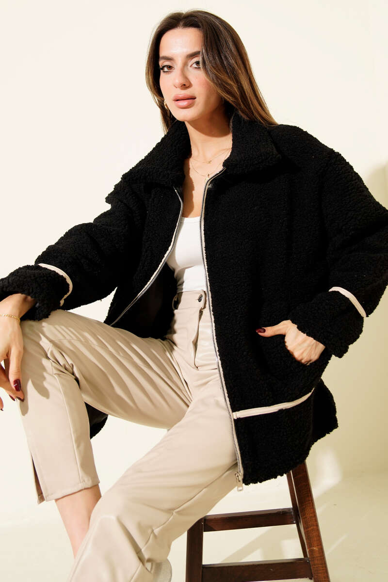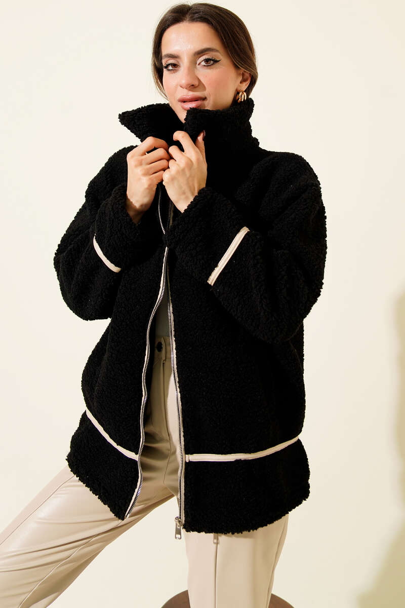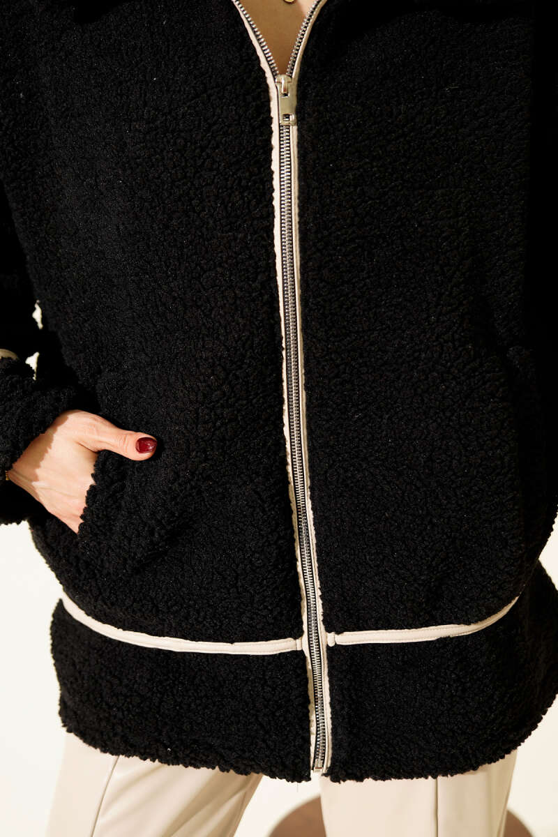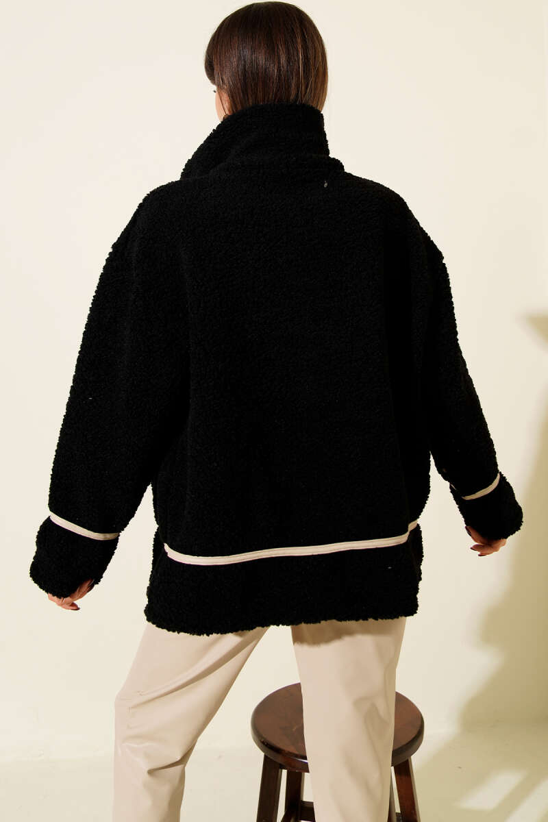 Dikiş Detaylı Düğmeli Kaşe Panço Siyah