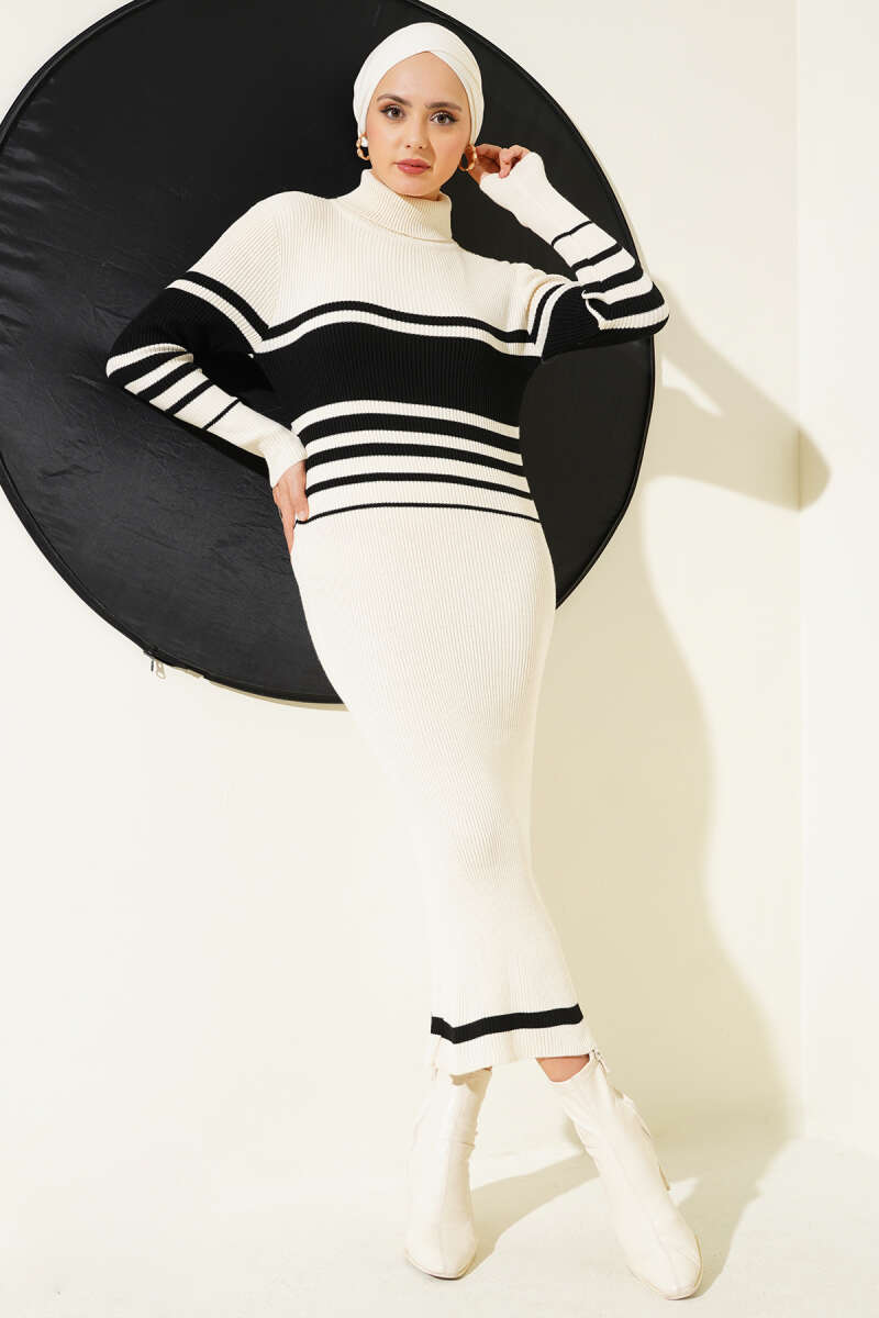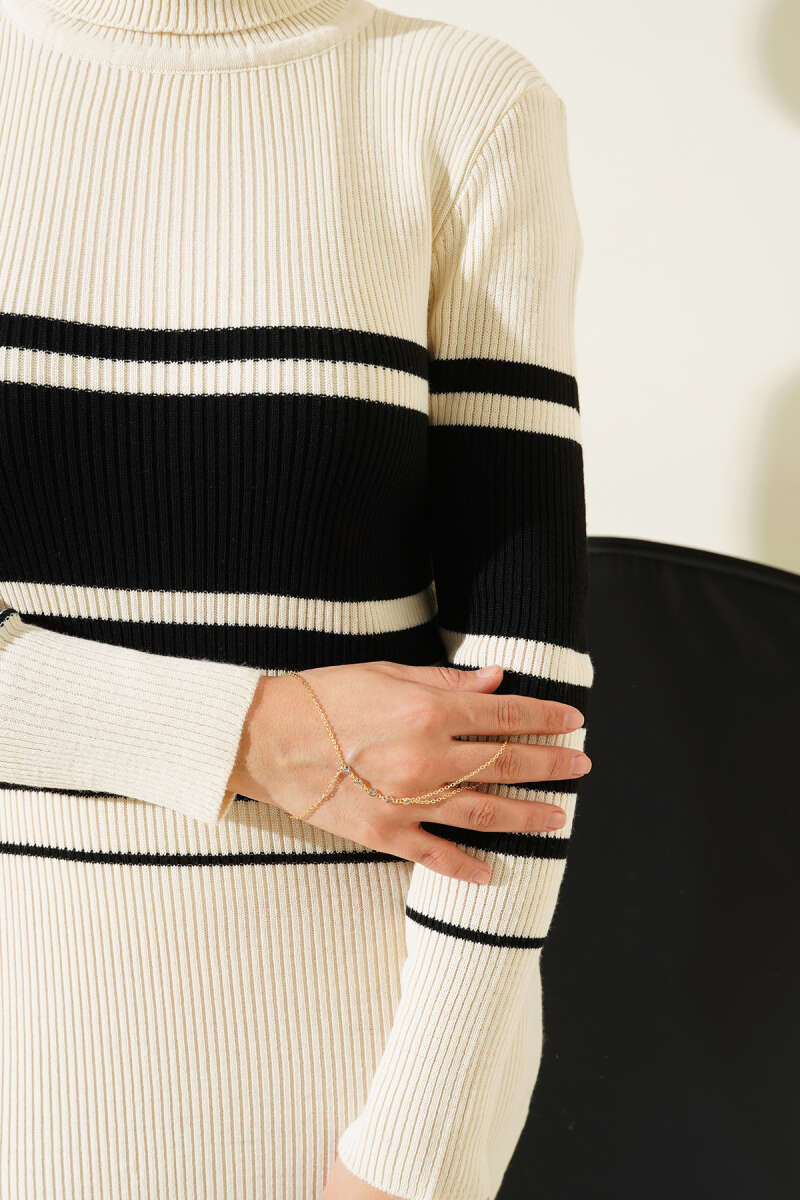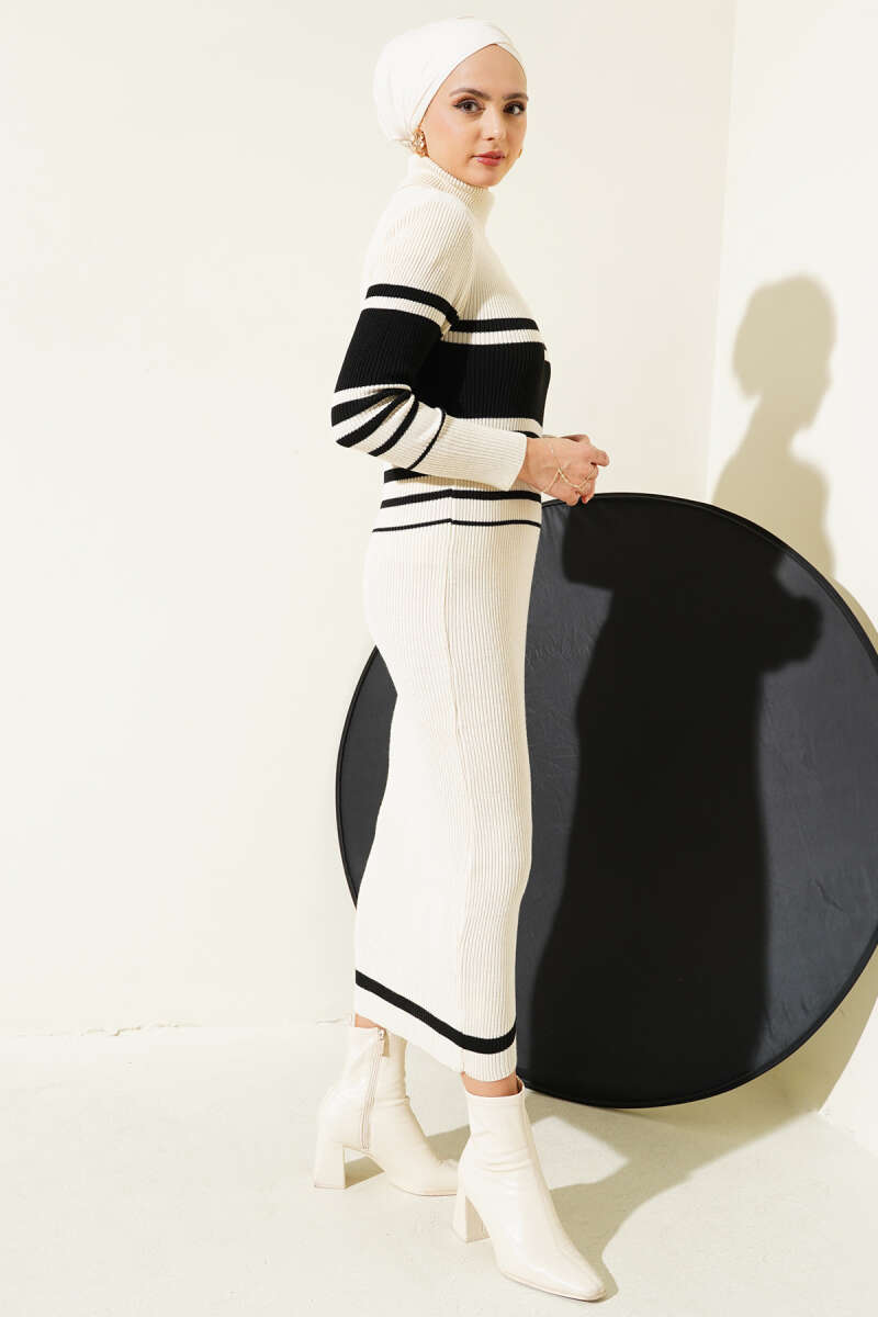 Boğazlı Fitilli Çizgili Triko Elbise Yeşil