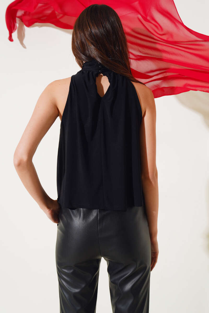 Boğazlı Kolsuz Sandy Bluz Siyah