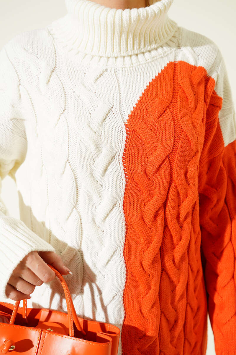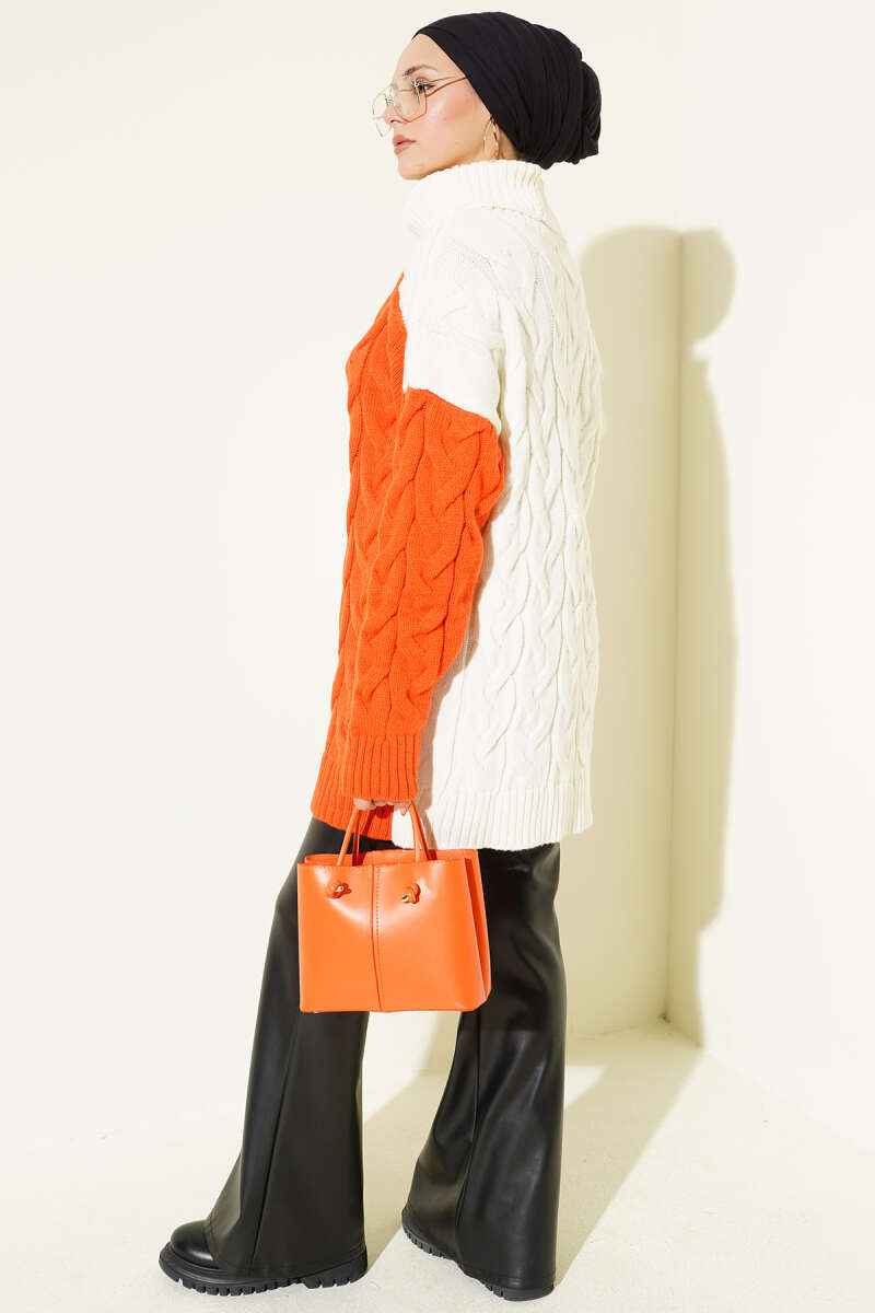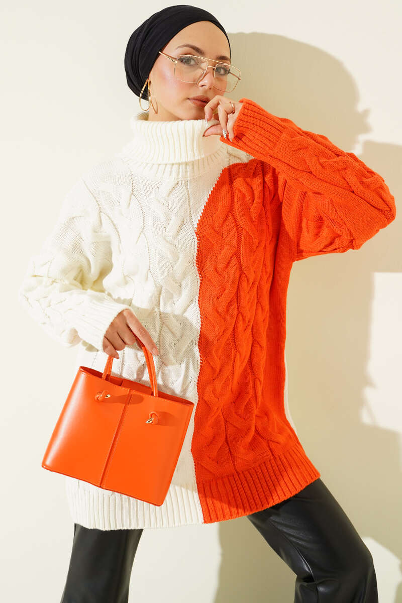 Boğazlı Örgü Kabartmalı Triko Tunik Oranj
