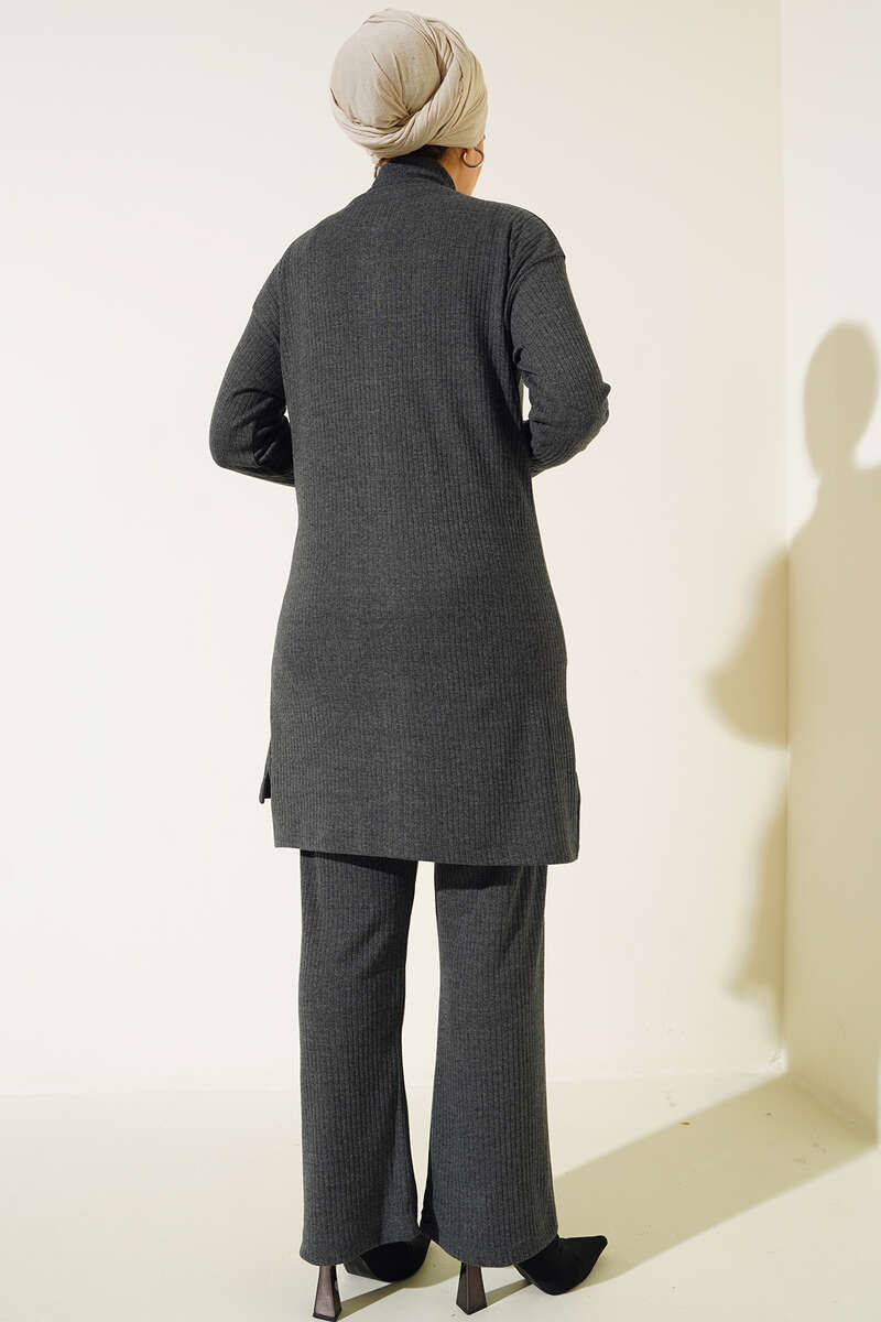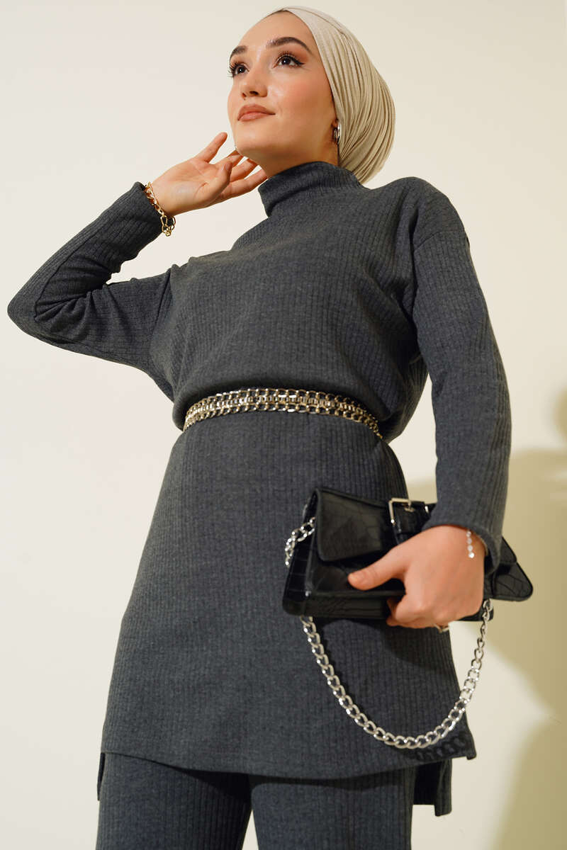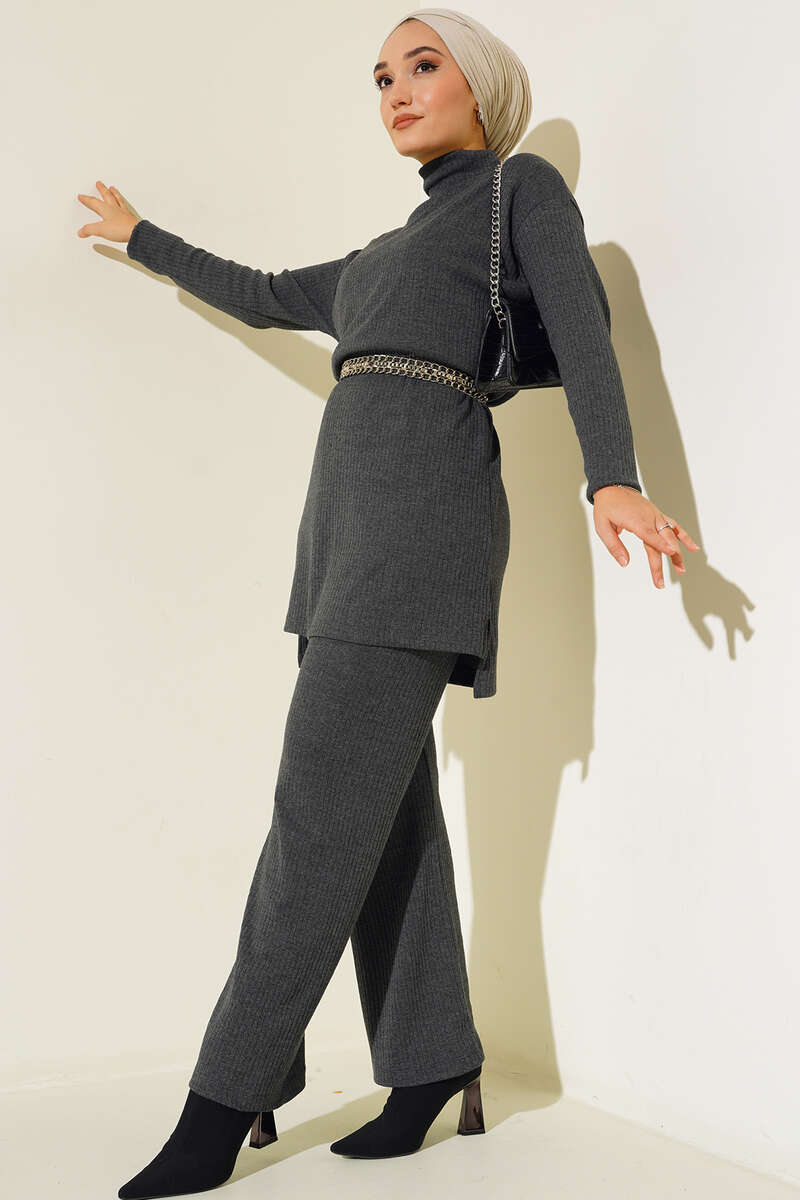 Yeni sezon ikili takımımız favorileriniz arasına girecek. Tuniğimiz boğazlıdır. Önü arkasına göre daha kısa olan tuniğimiz düşük omuzlu modeldir. Pantolonumuzun beli lastiklidir. Yüksek bel olup salaş modeldir. Cepsizdir. Sportif kombinlerinize çok yakışacak takımımızın rahatlığına bayılacaksınız. Kemer aksesuar olarak kullanılmıştır.