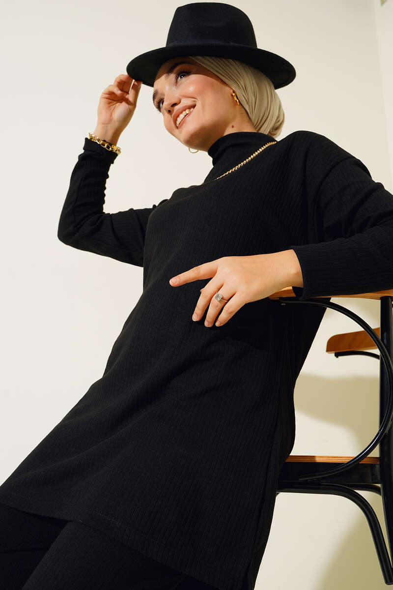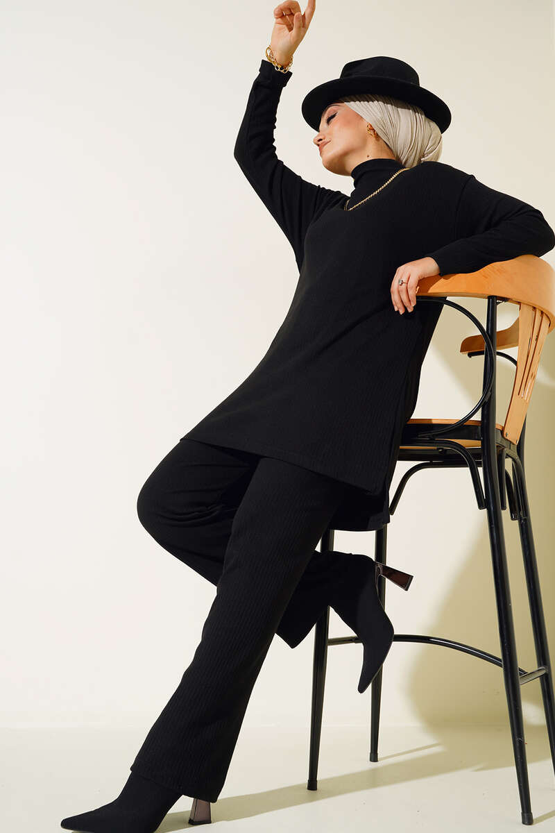 Yeni sezon ikili takımımız favorileriniz arasına girecek. Tuniğimiz boğazlıdır. Önü arkasına göre daha kısa olan tuniğimiz düşük omuzlu modeldir. Pantolonumuzun beli lastiklidir. Yüksek bel olup salaş modeldir. Cepsizdir. Sportif kombinlerinize çok yakışacak takımımızın rahatlığına bayılacaksınız. Kolye aksesuar olarak kullanılmıştır.