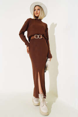 İnci Süslemeli Etekli Triko İkili Takım Kahve