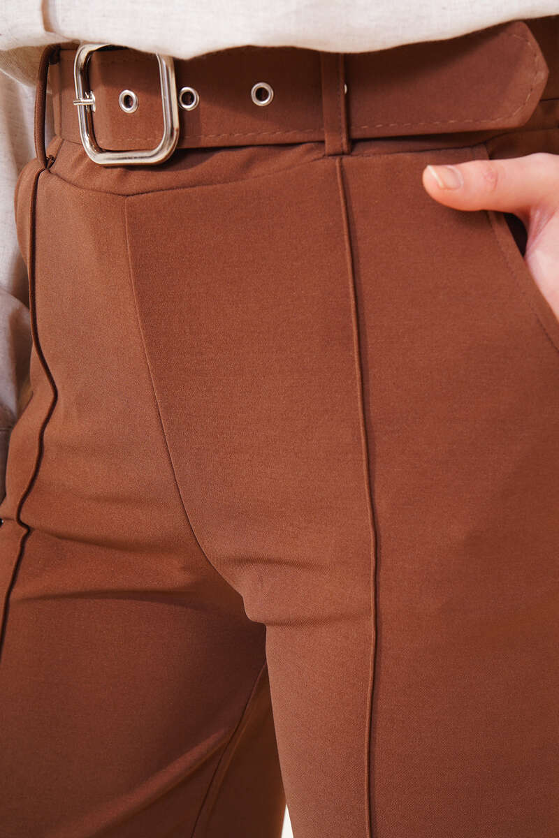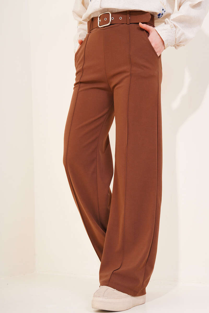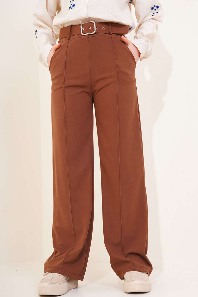 Yeni sezon bol paça pantolonumuz kombinlerinize şık bir dokunuş yapacak çımalı modeldir. Yüksek bel olan pantolonumuz kemerlidir. Kemeri kendi rengidir. Yanlarında iki adet cebi vardır. Cepleri kullanılabilmektedir.