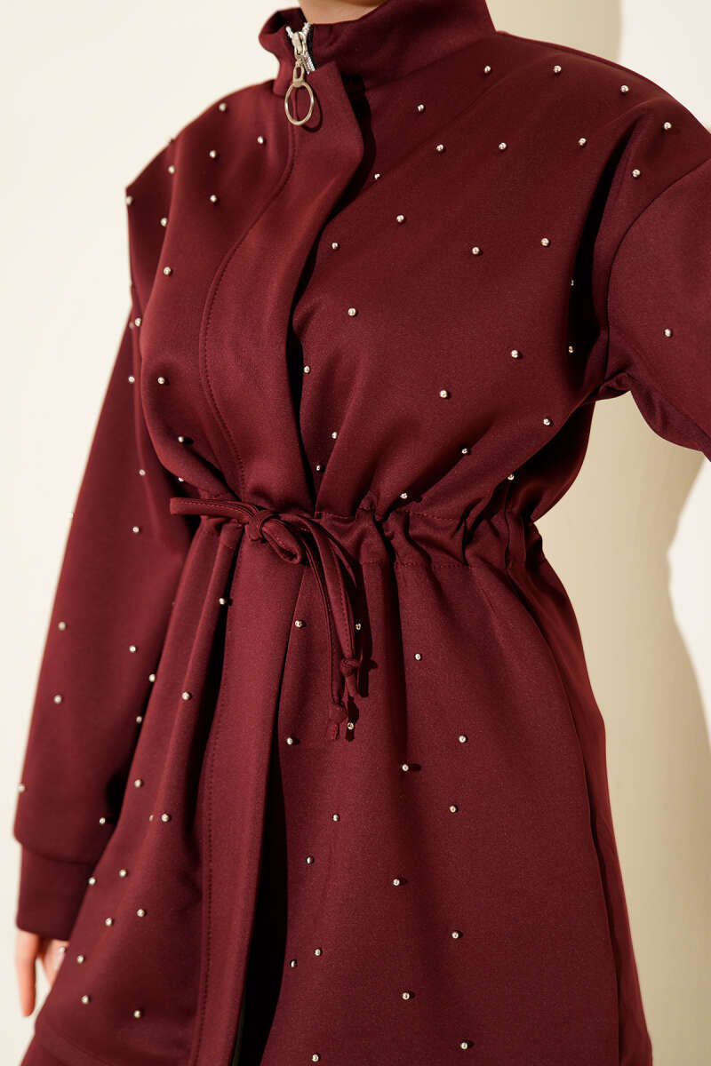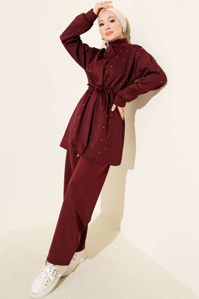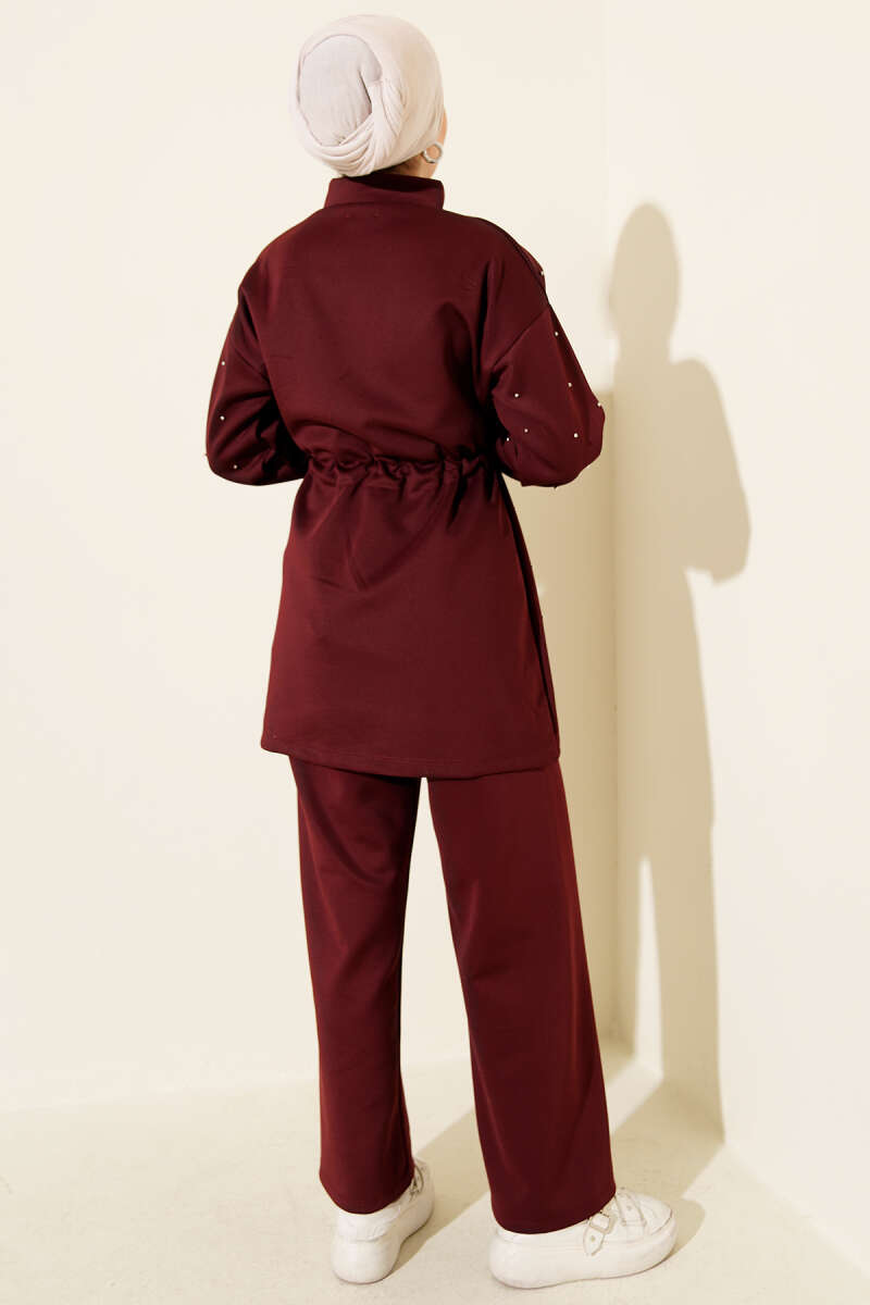 Kol Şeritli Düğmeli Scuba İkili Takım Bordo