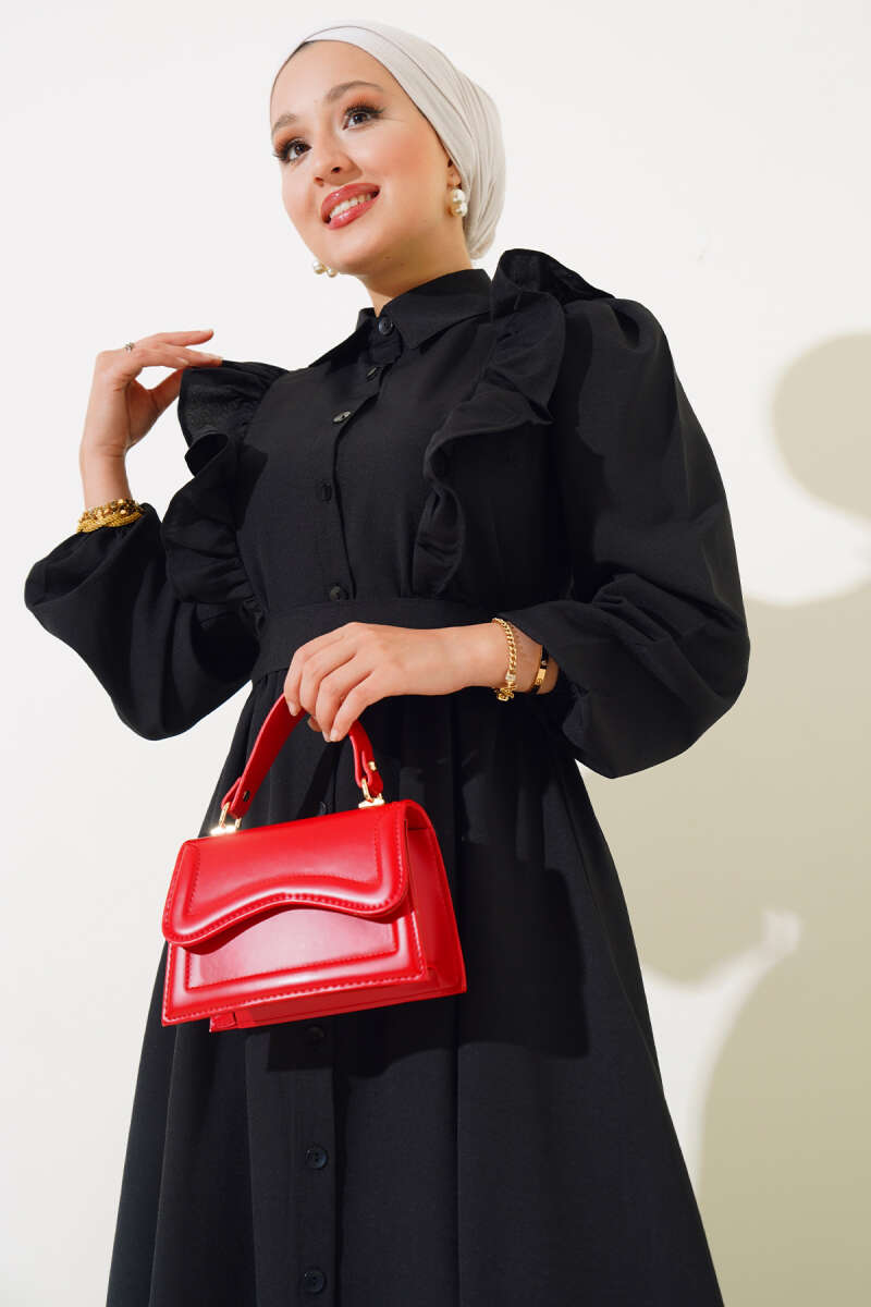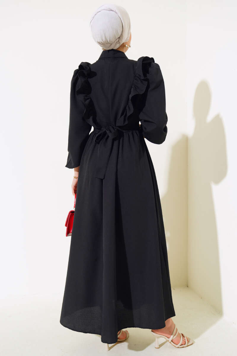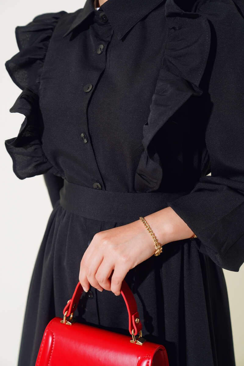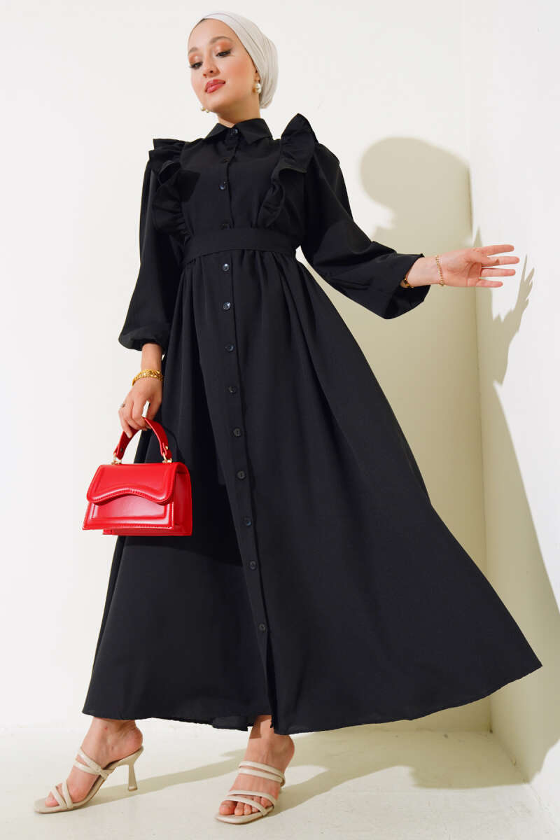 Yarıdan Düğmeli Şifon Elbise Siyah