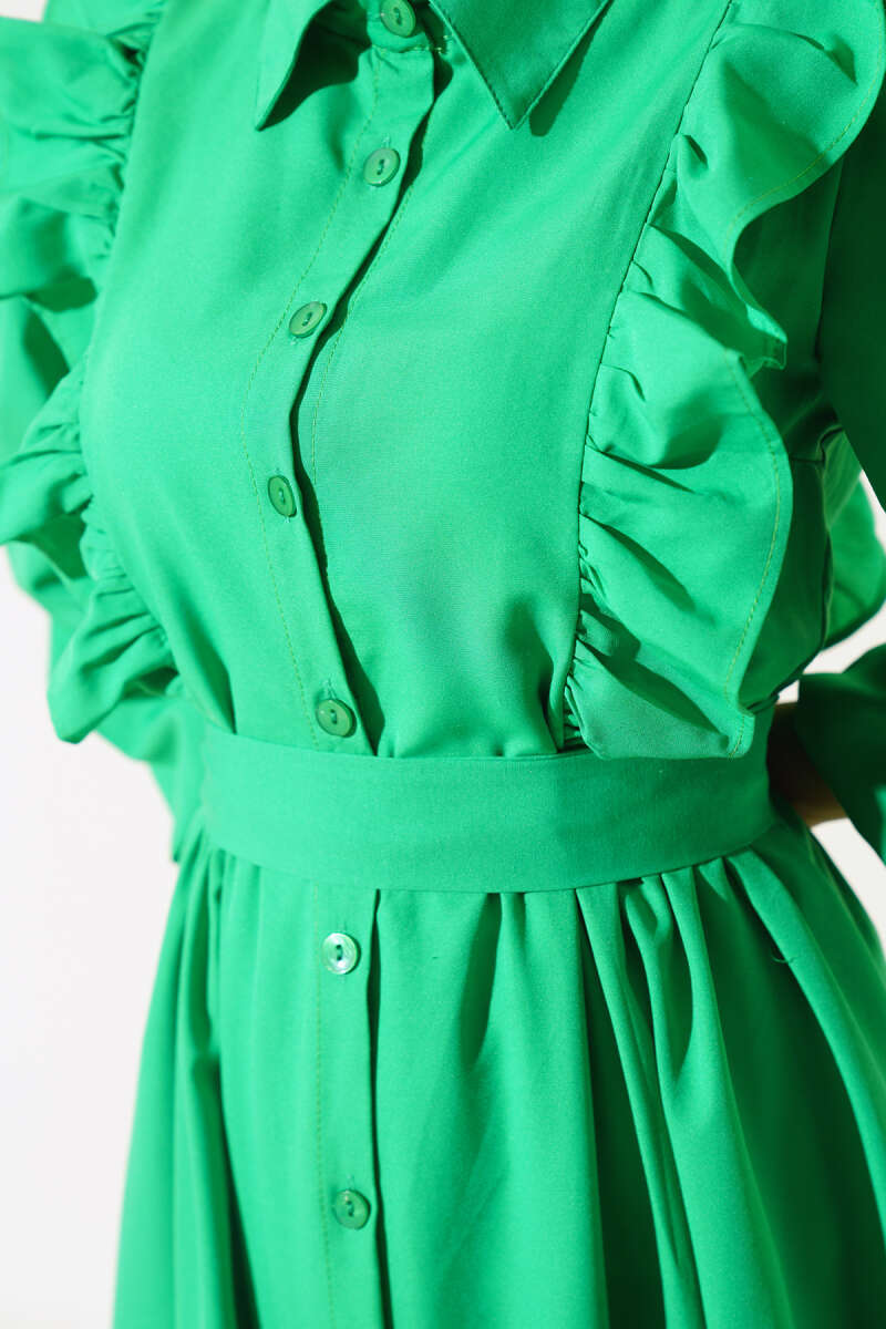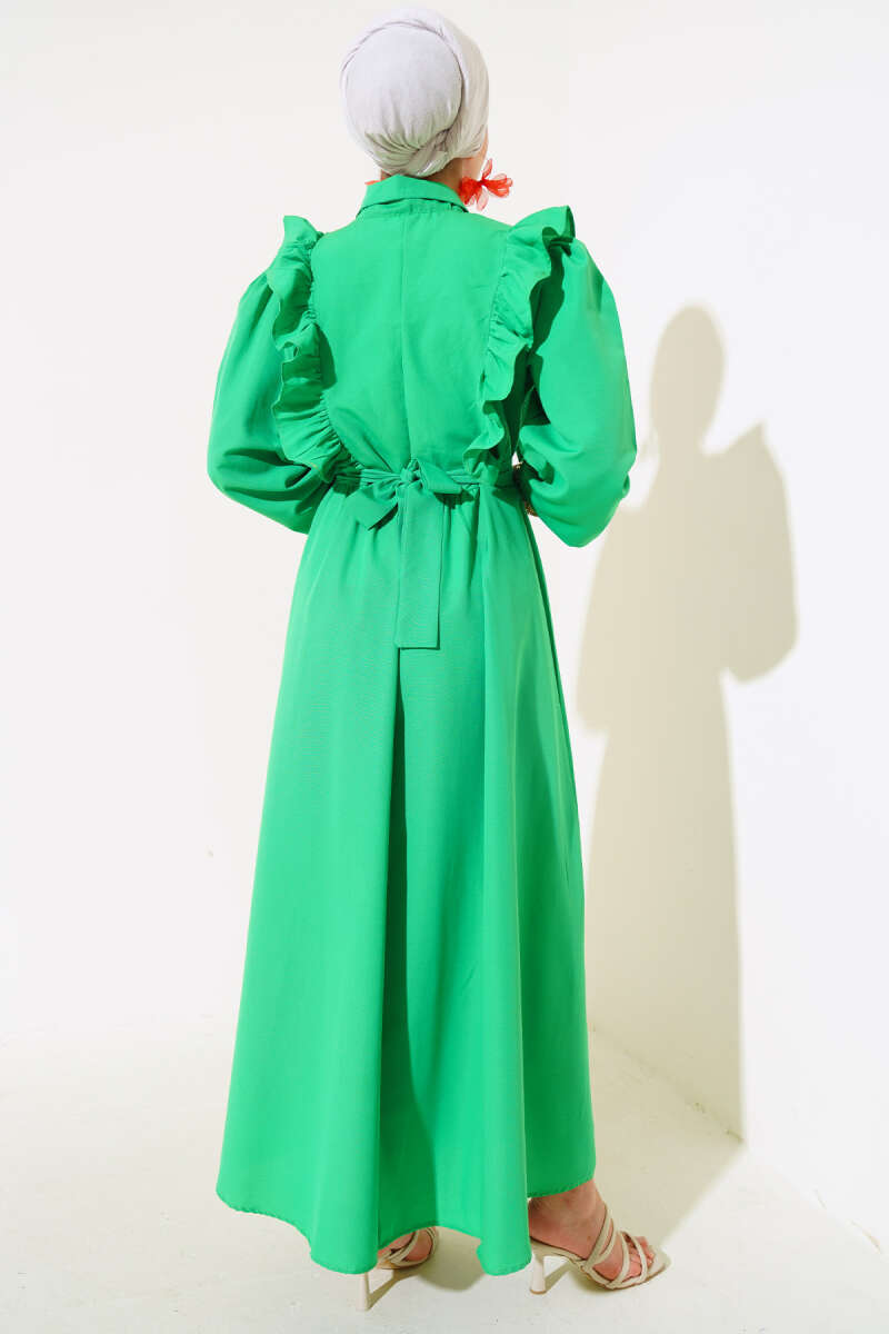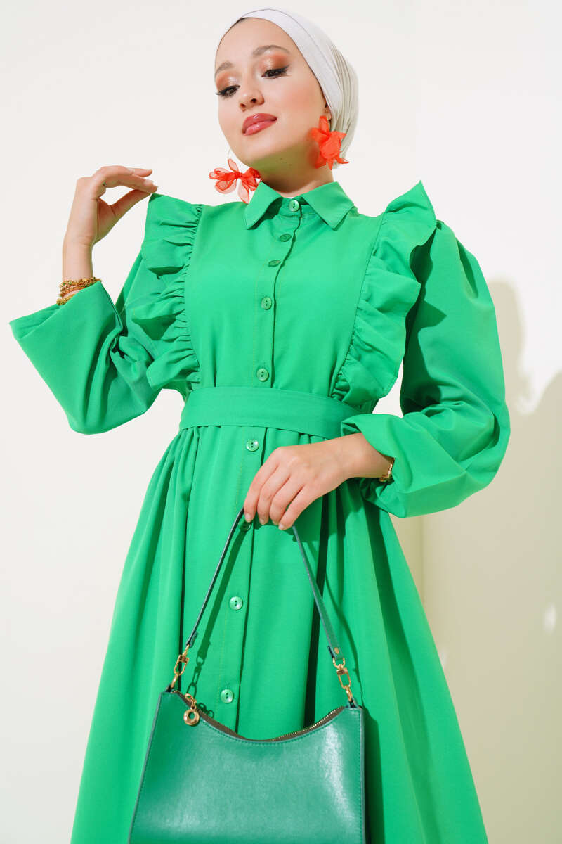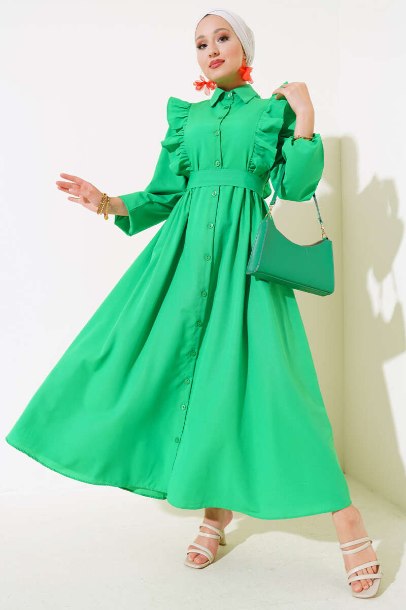 Batik Desen Bel Lastikli Elbise Yağ Yeşili