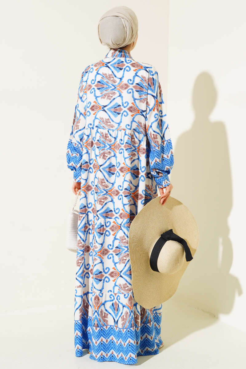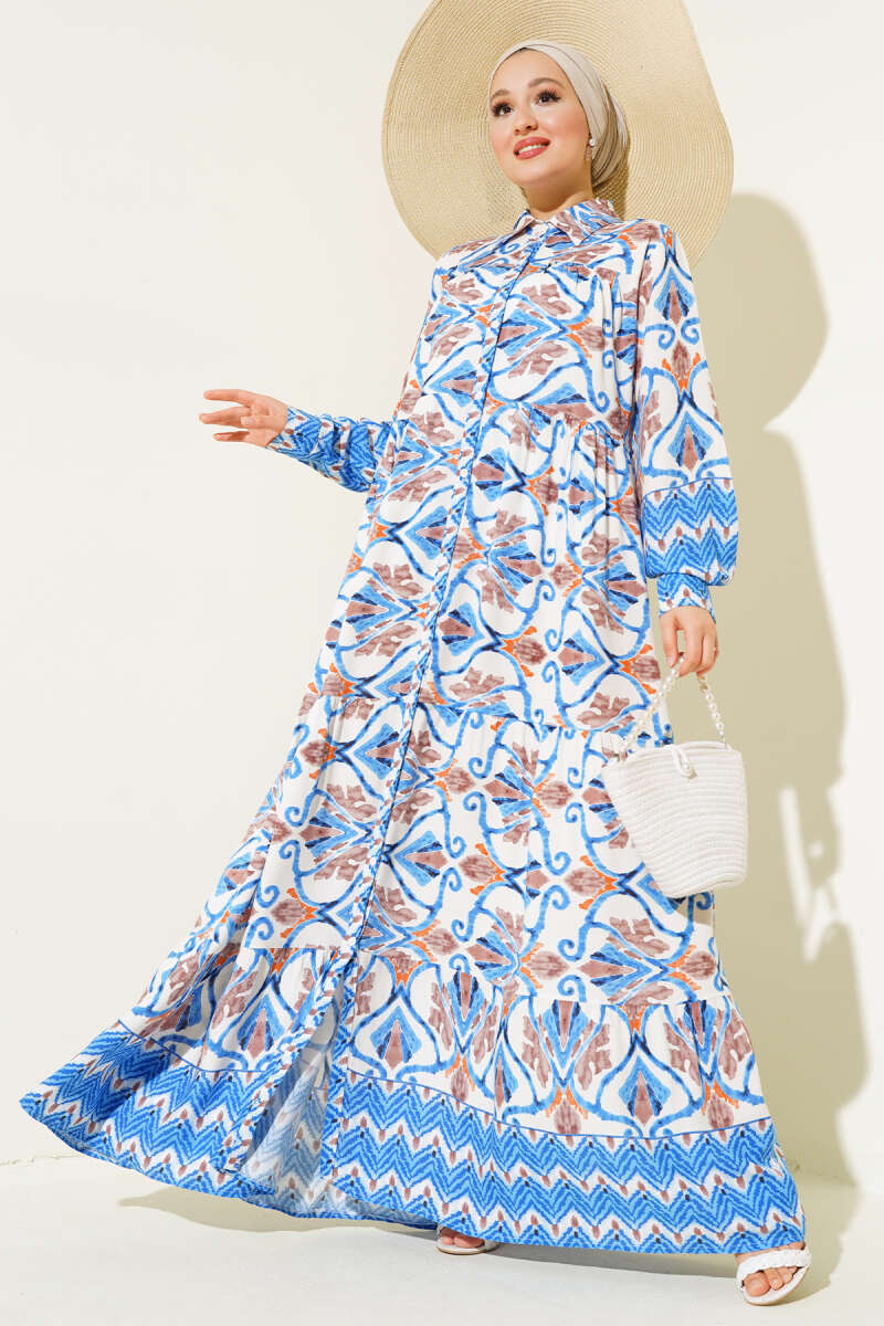 Paisley Desen Bel Lastikli Elbise Lacivert