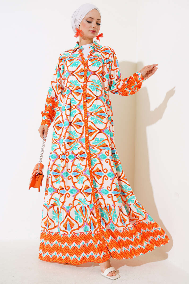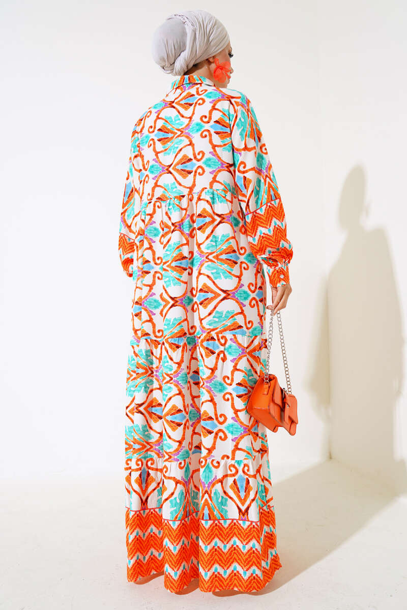 Yarım Düğmeli Etnik Desen Kat Elbise Mor