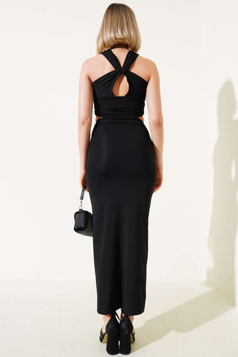 Boydan Bağlamalı Dekolteli Elbise Siyah