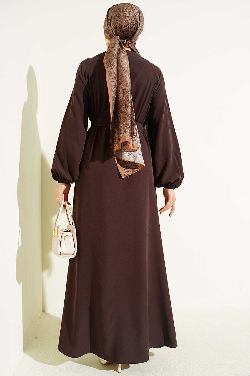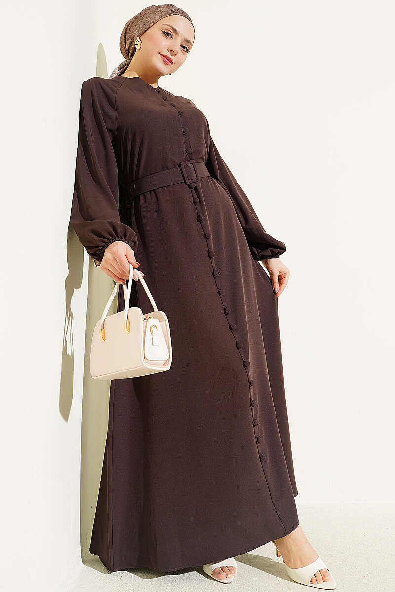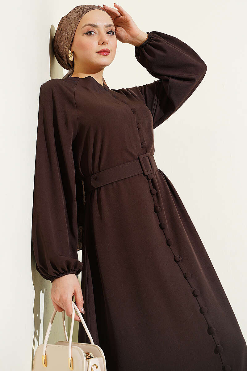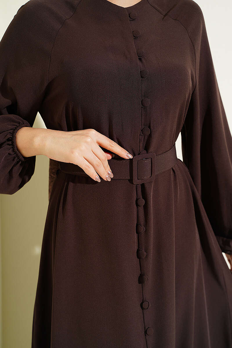 Boydan Brit Düğmeli Kemerli Elbise Kahve