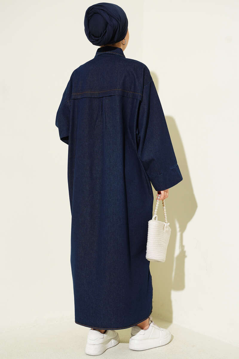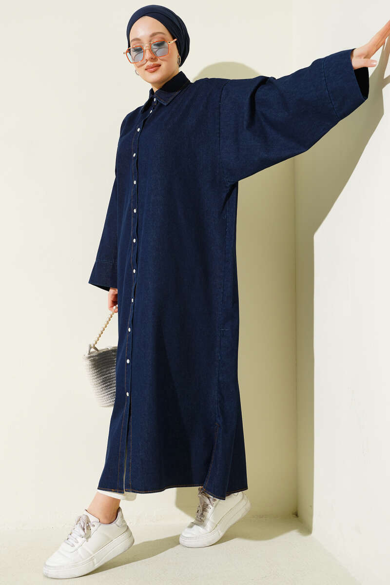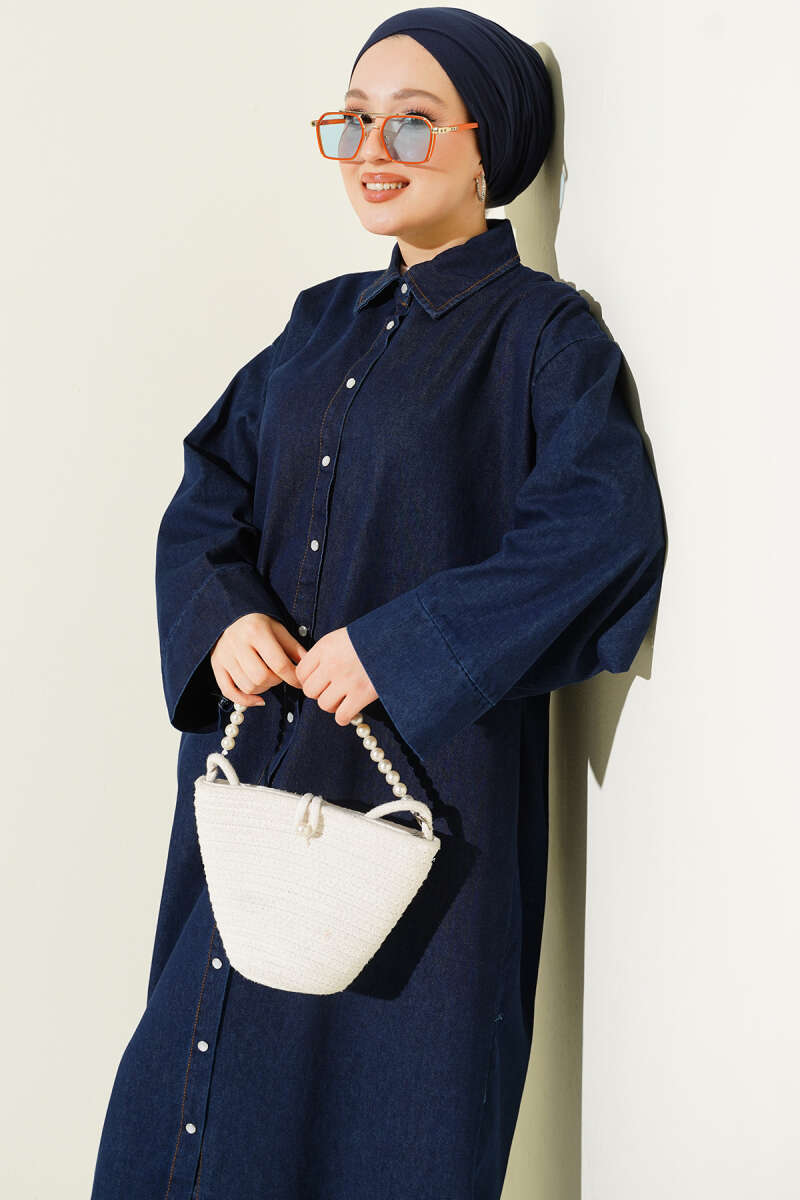 Boydan Çıtçıt Düğmeli Oversize Kot Elbise Mavi