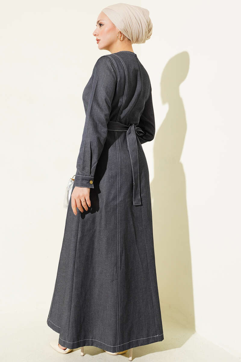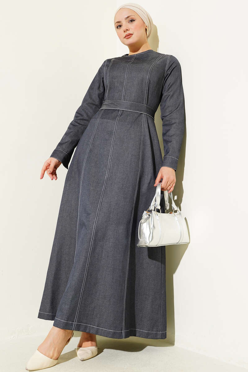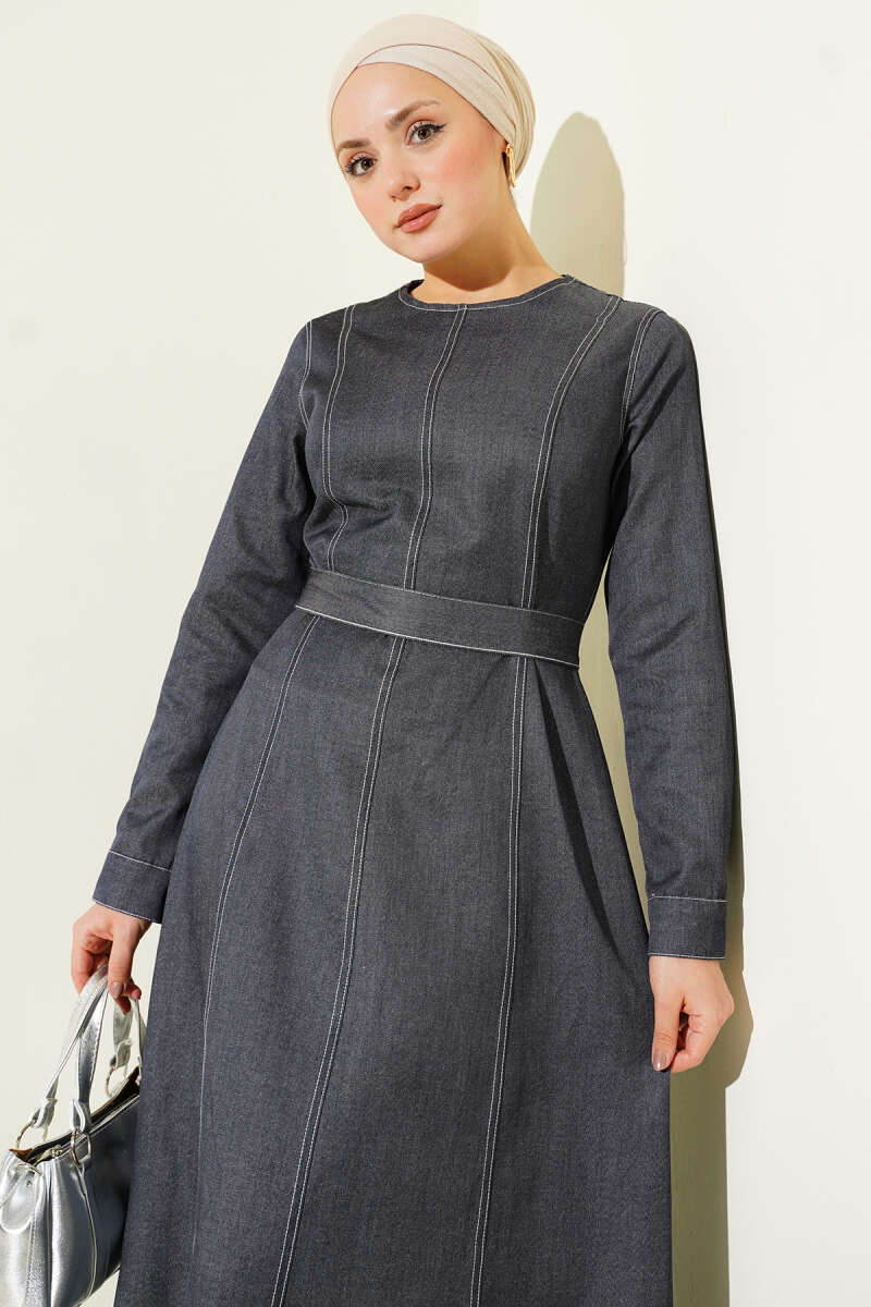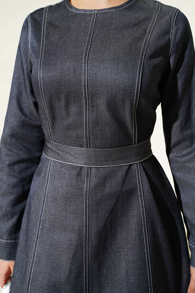 Boydan Dikiş Detaylı Kot Elbise Kot Mavisi