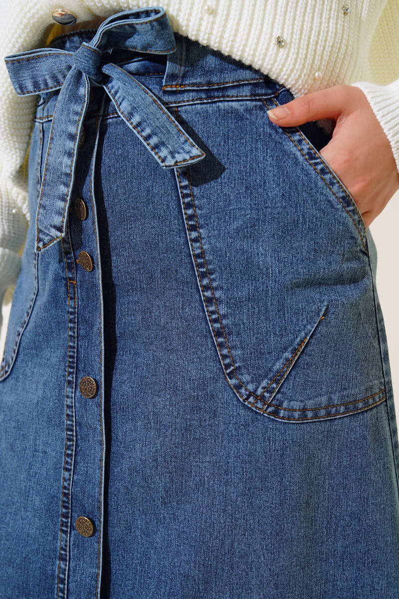 Yeni sezon kot eteğimiz şık duruşuyla favoriniz olacak. Eteğimizin beli kuşaklı olup kuşağı tünellidir. Kemer köprüsü bulunmamaktadır. Ön tarafta iki adet cebi bulunmaktadır. Cepleri kullanılabilir. Eteğimizin boydan ilk beş düğmesi kullanılabilir gerisi düğme süslemeleridir. Rahatlıkla kombinleyebileceğiniz eteğimiz sizleri beklemekte.