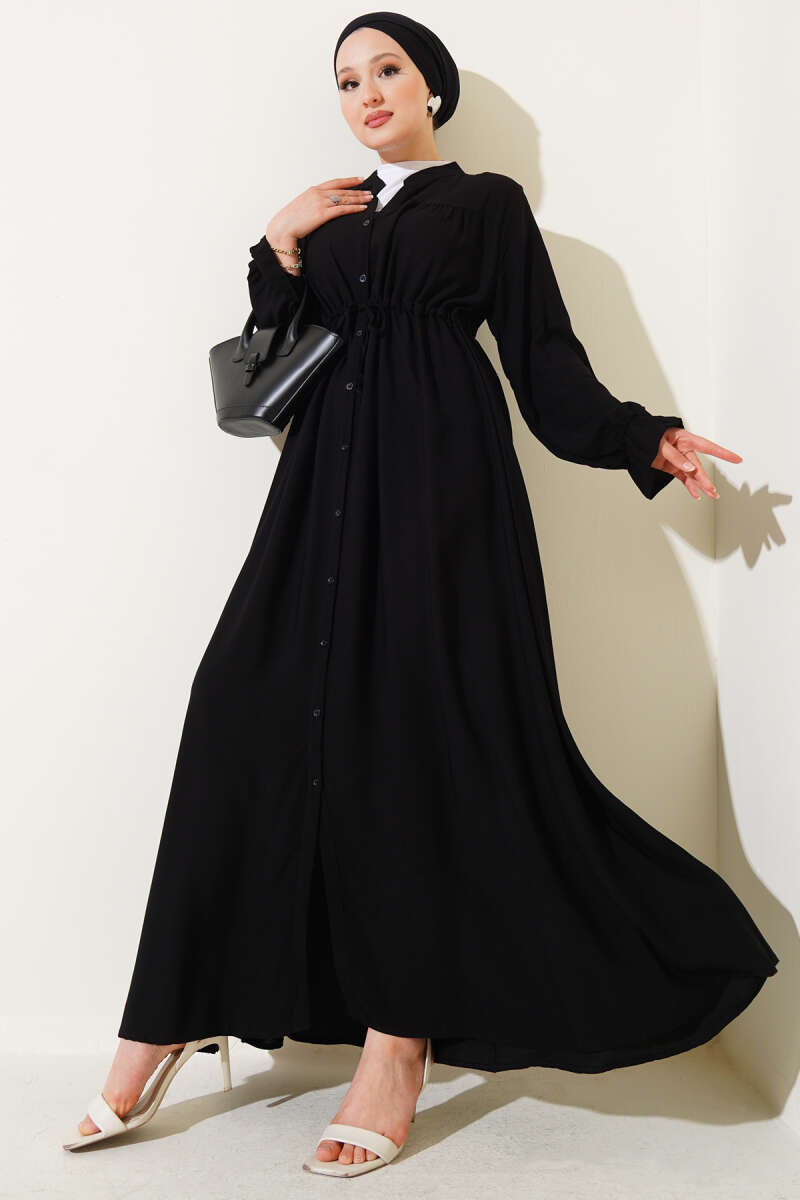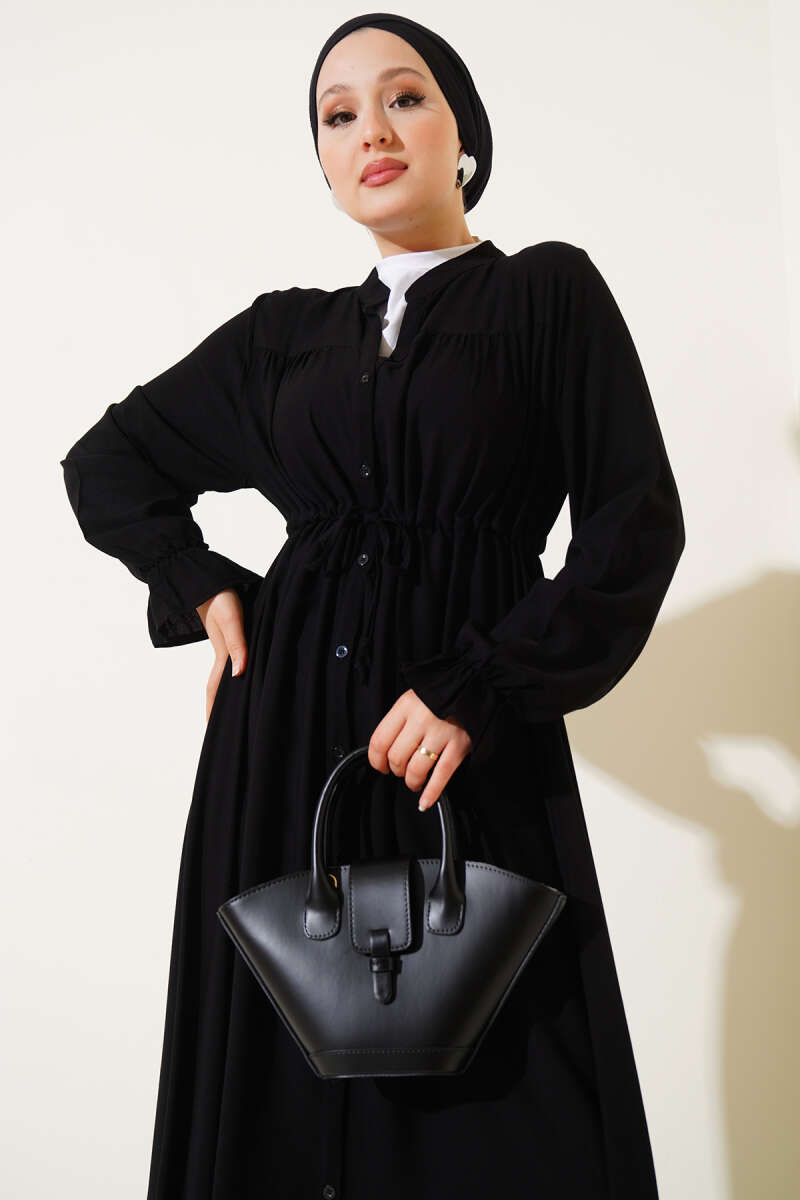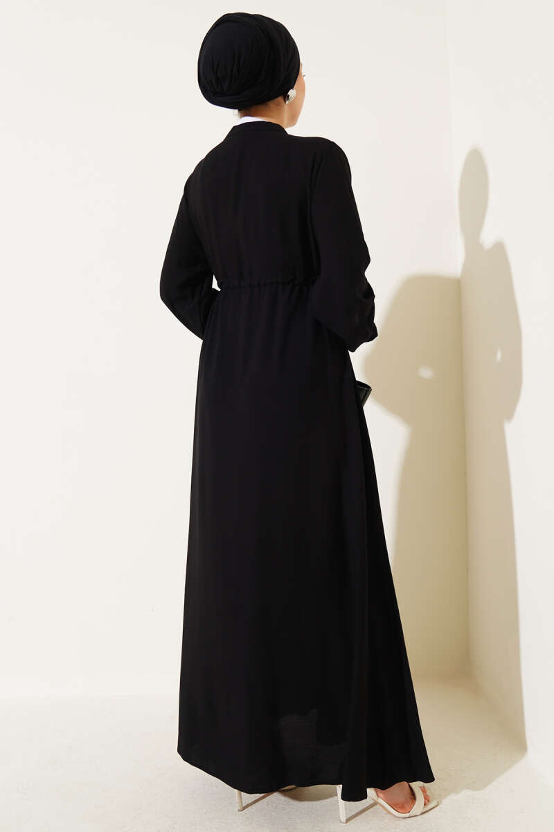 Boydan Düğmeli Bel Tünelli Basic Elbise Siyah