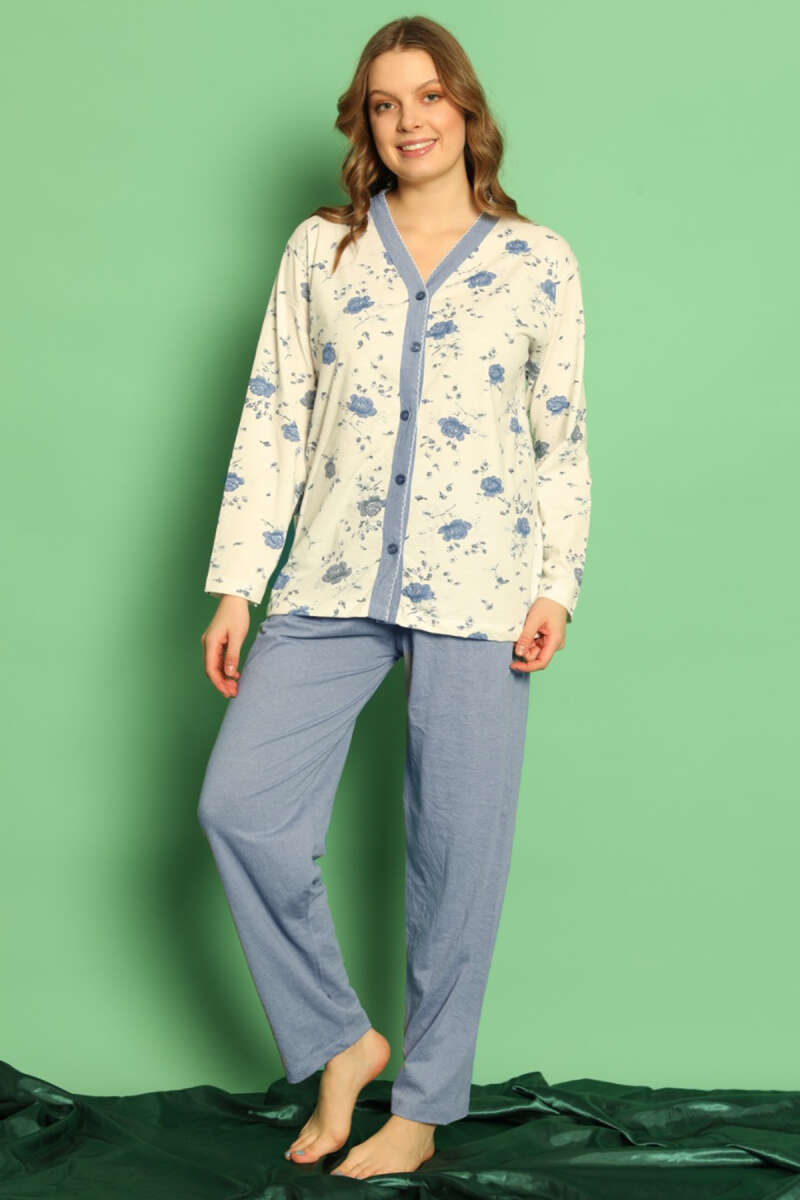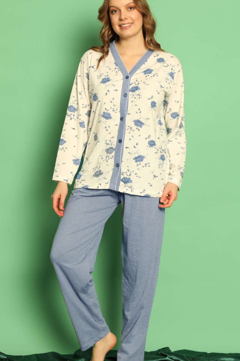 Boydan Düğmeli Çiçekli Uzun Kol Pijama Takım Mavi