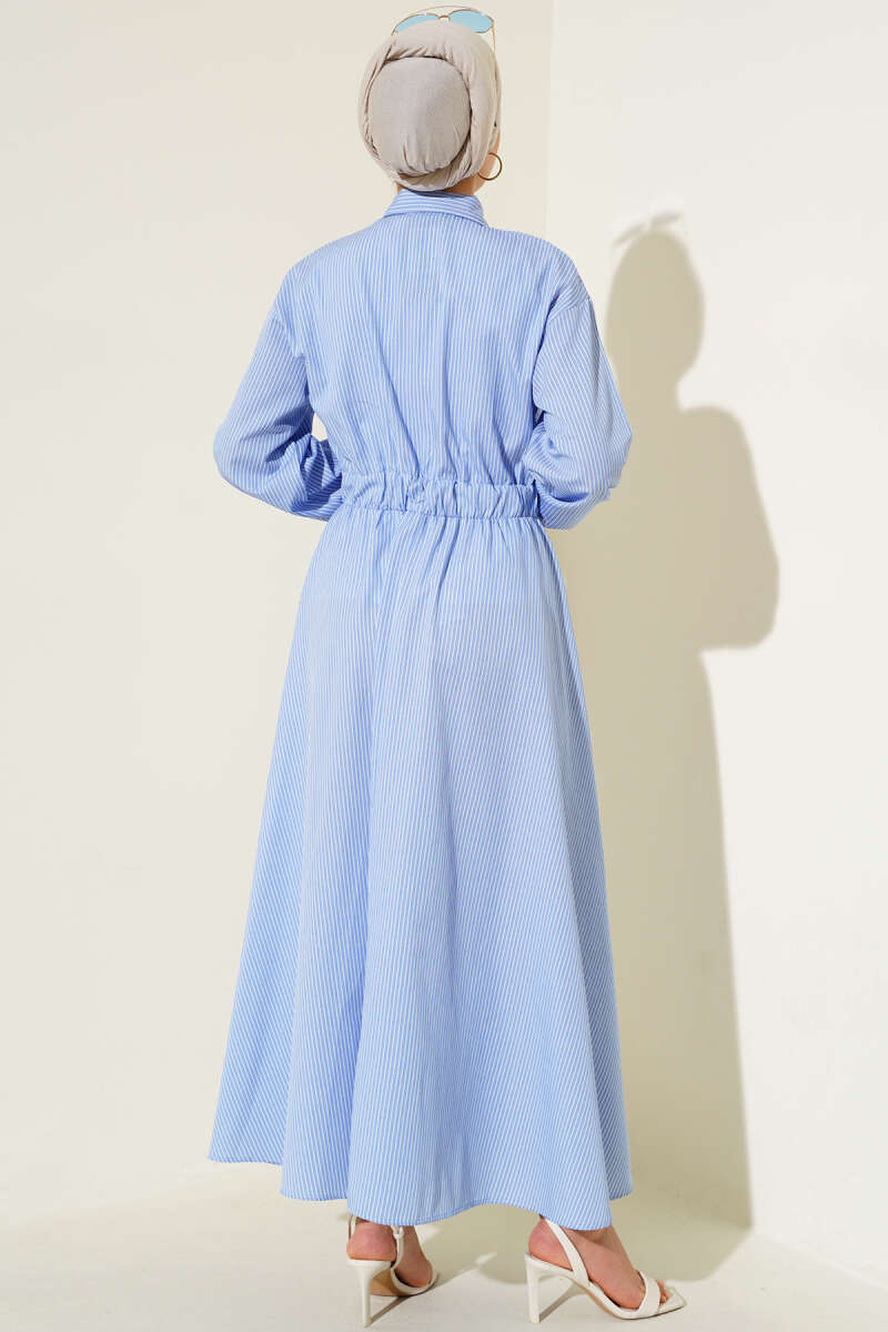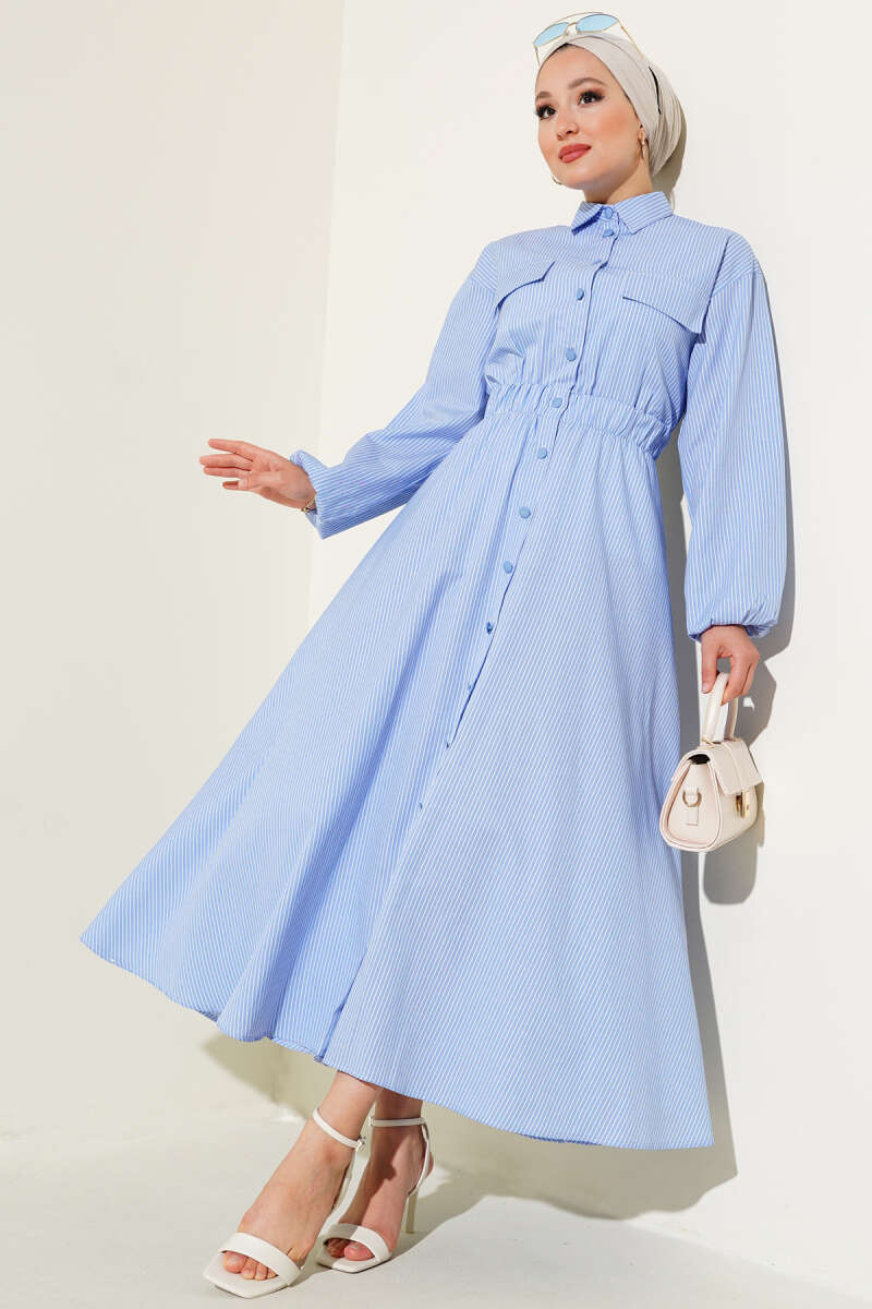 Boydan Düğmeli Çizgili Elbise Mavi