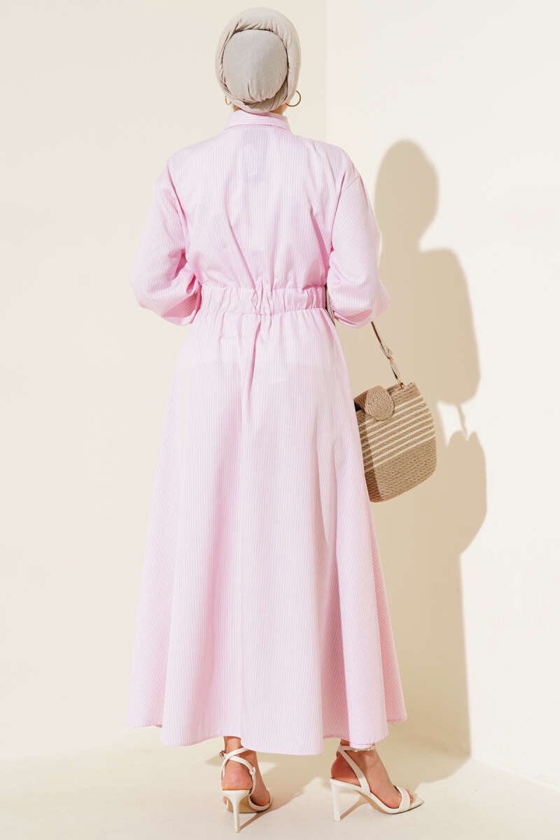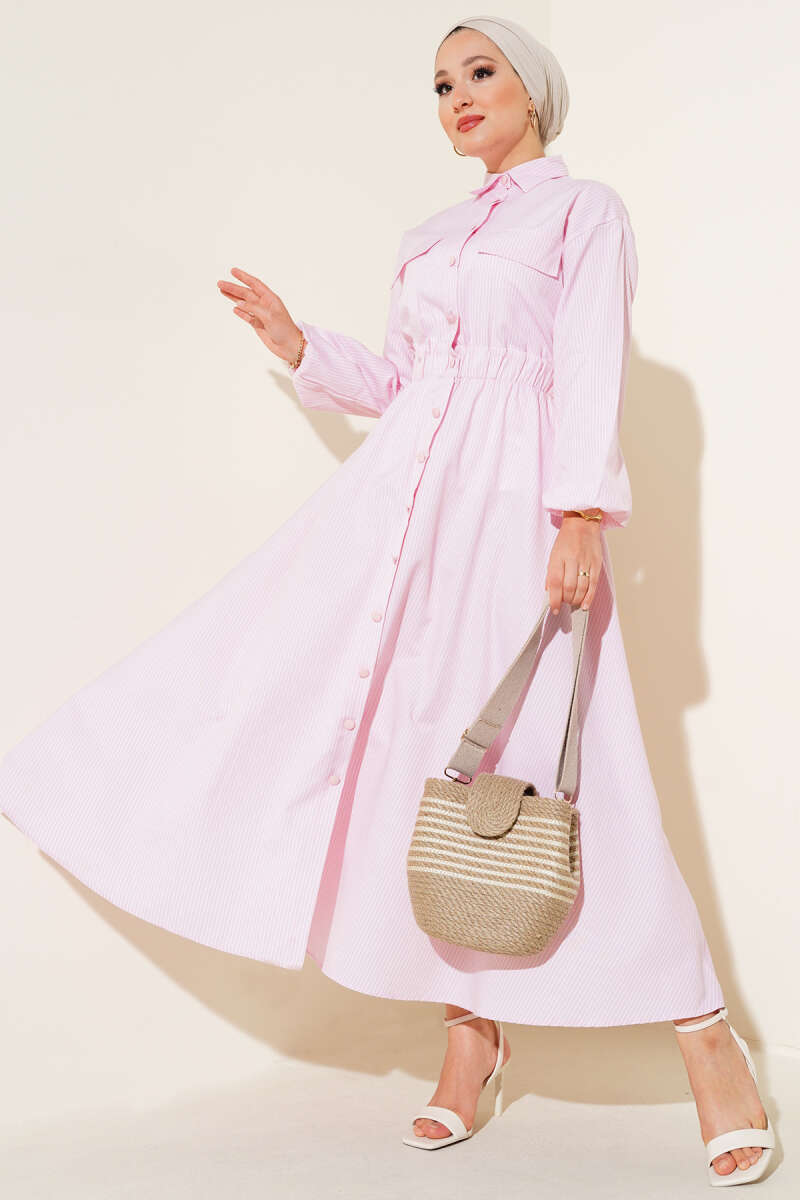 Yeni sezon elbisemiz şık tarzıyla sizlerle beraber. Elbisemiz boydan düğmelidir. Gömlek yakadır. Beli ve kol bilekleri lastiklidir. Elbisemizin göğsünde iki adet süs cep kapağı vardır. Astarsızdır. Bahar ve yaz aylarının favorisi olacaktır.