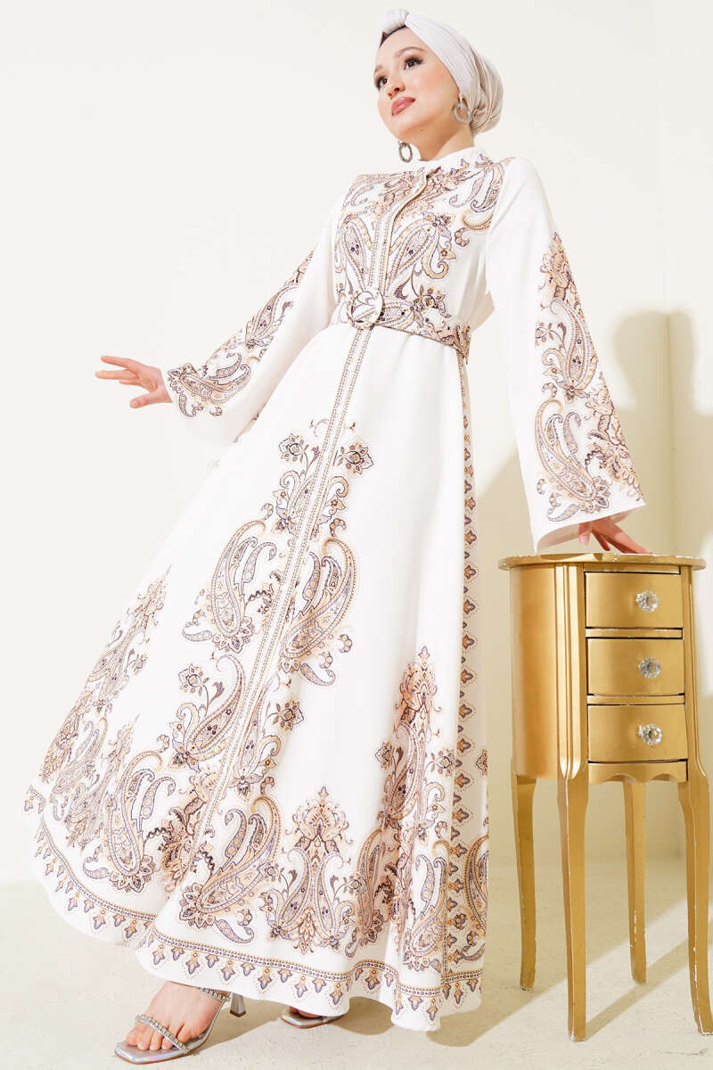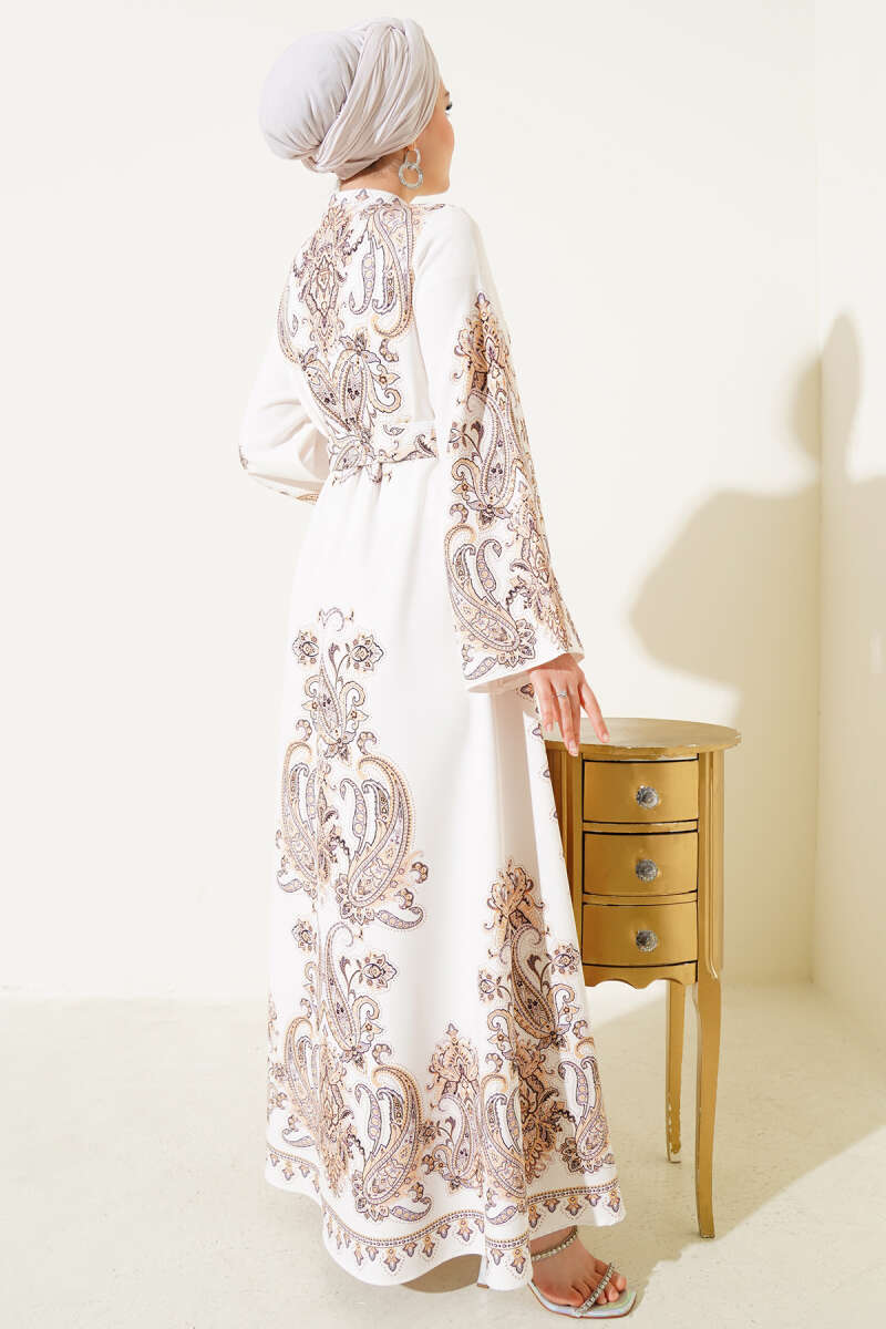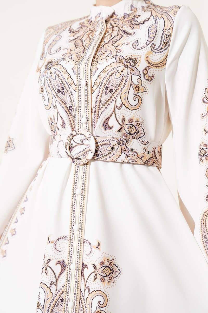 Boydan Düğmeli Desenli Kemerli Elbise Ekru