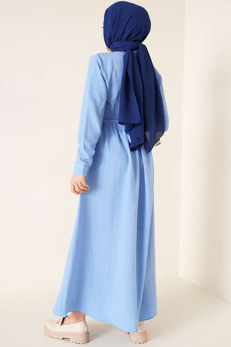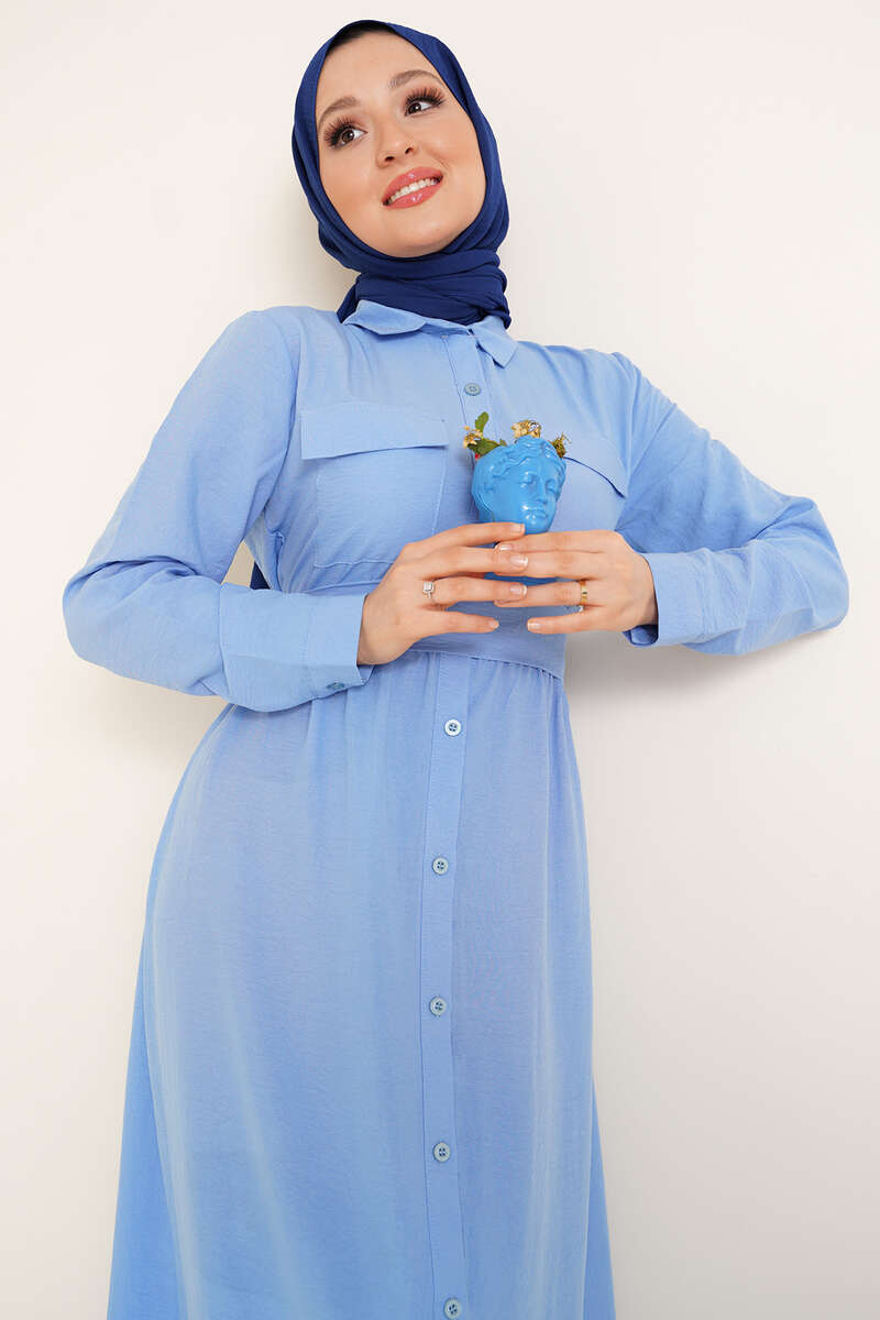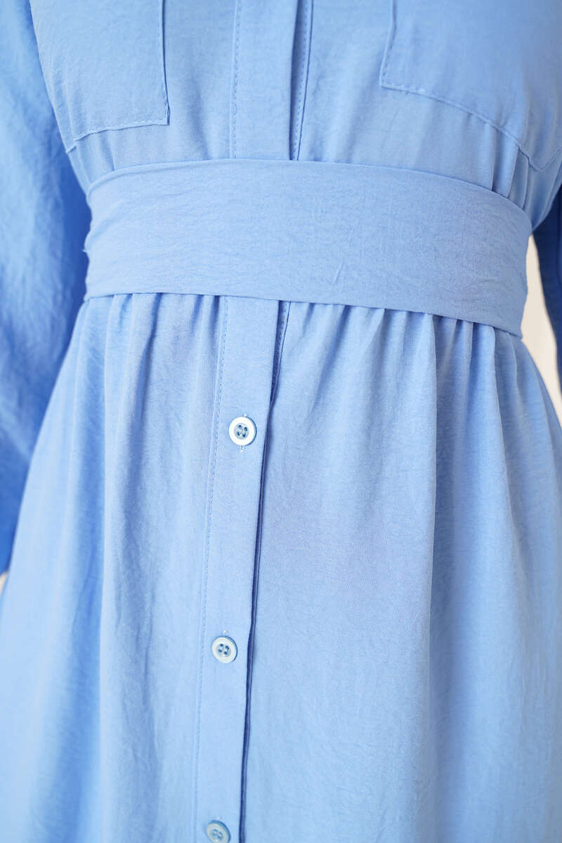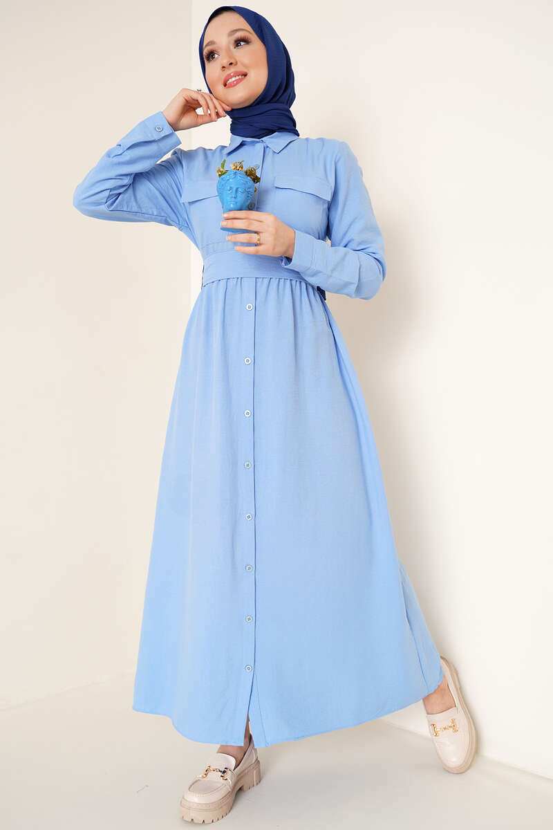 Yeni sezon boydan düğmeli elbisemiz şık bir görünüm için doğru bir tercihtir. Ön kısmında düğmeleri bulunan elbisemiz kolay giyilip çıkarılabilir. Elbisenin belinde bulunan kuşak isteğe bağlı olarak bağlanabilir veya çıkarılabilir. İki adet kemer köprüsü bulunan elbisemizin göğsünde iki adet kapaklı cebi bulunmaktadır.
