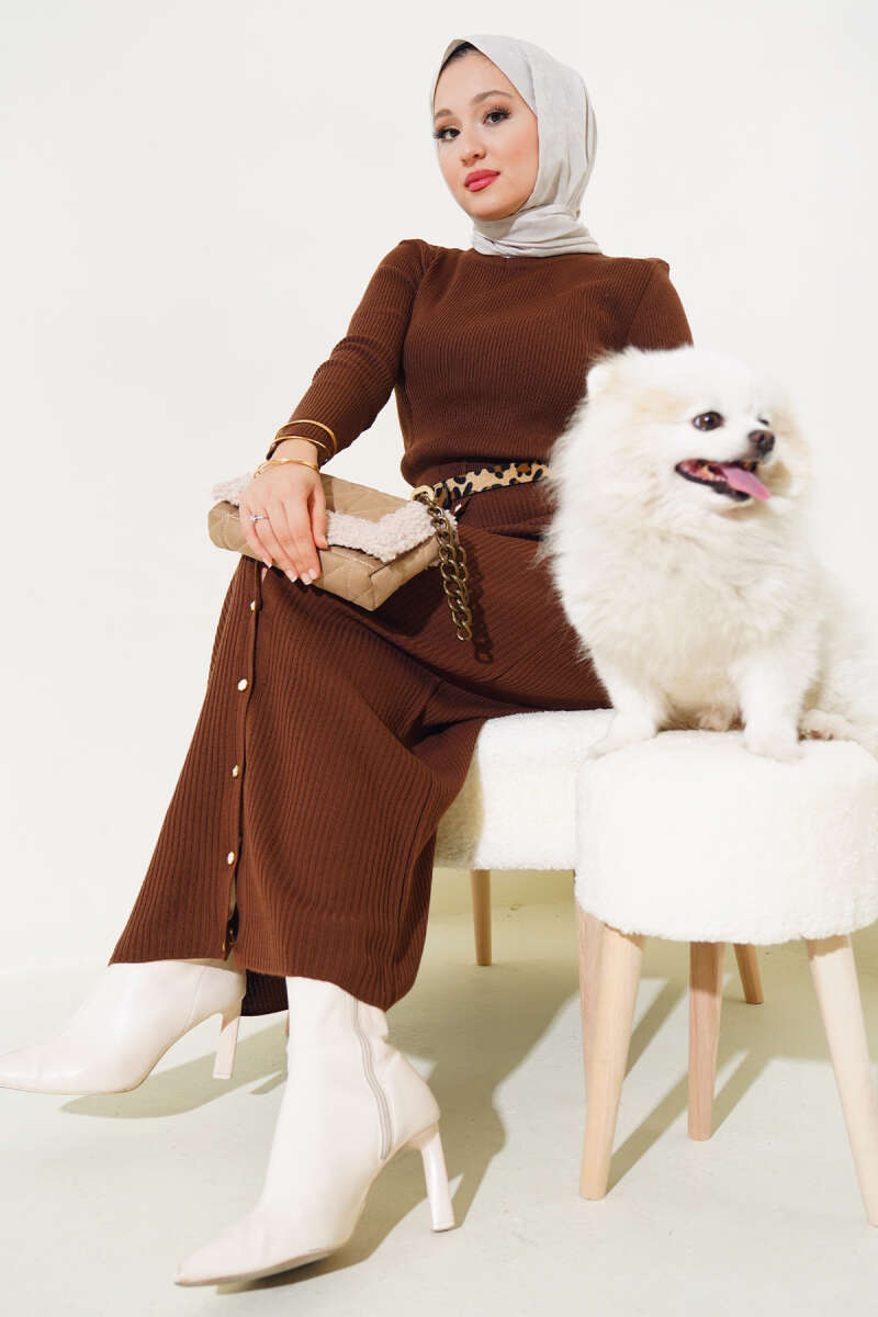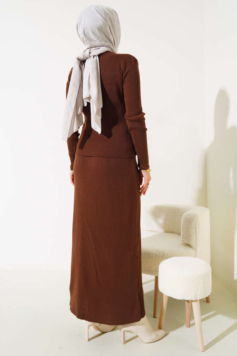 Balon Kol Balıkçı Yaka Triko İkili Takım Kahve