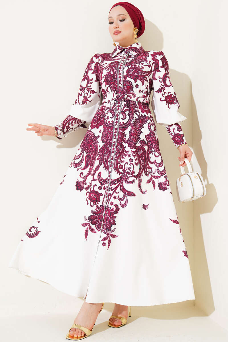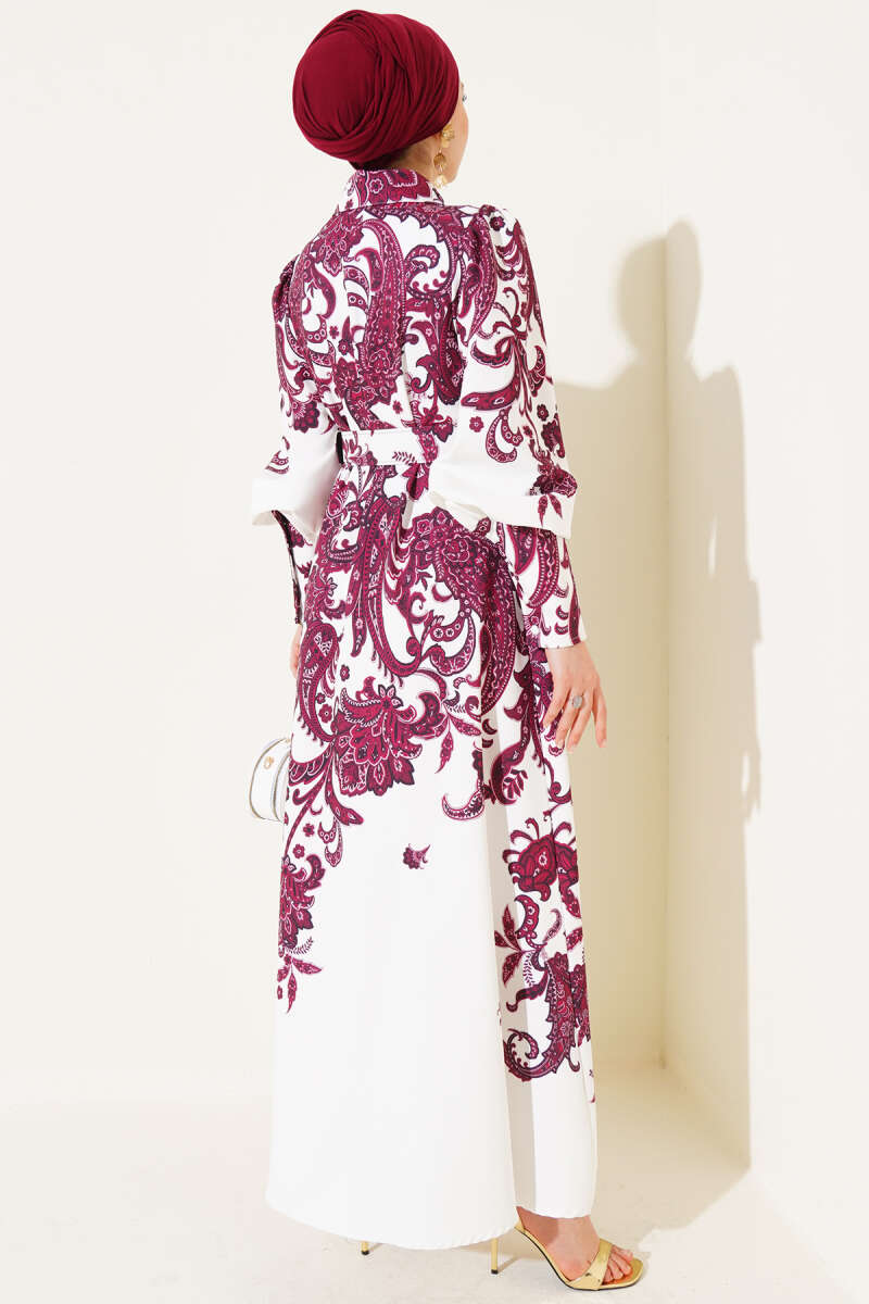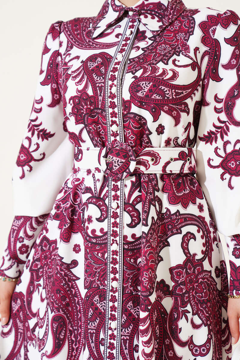 Ekose Desenli Kemerli Jile Elbise Bordo