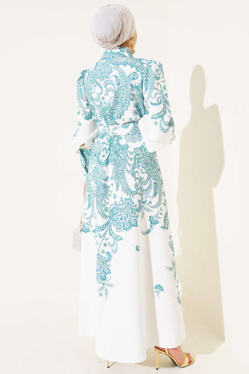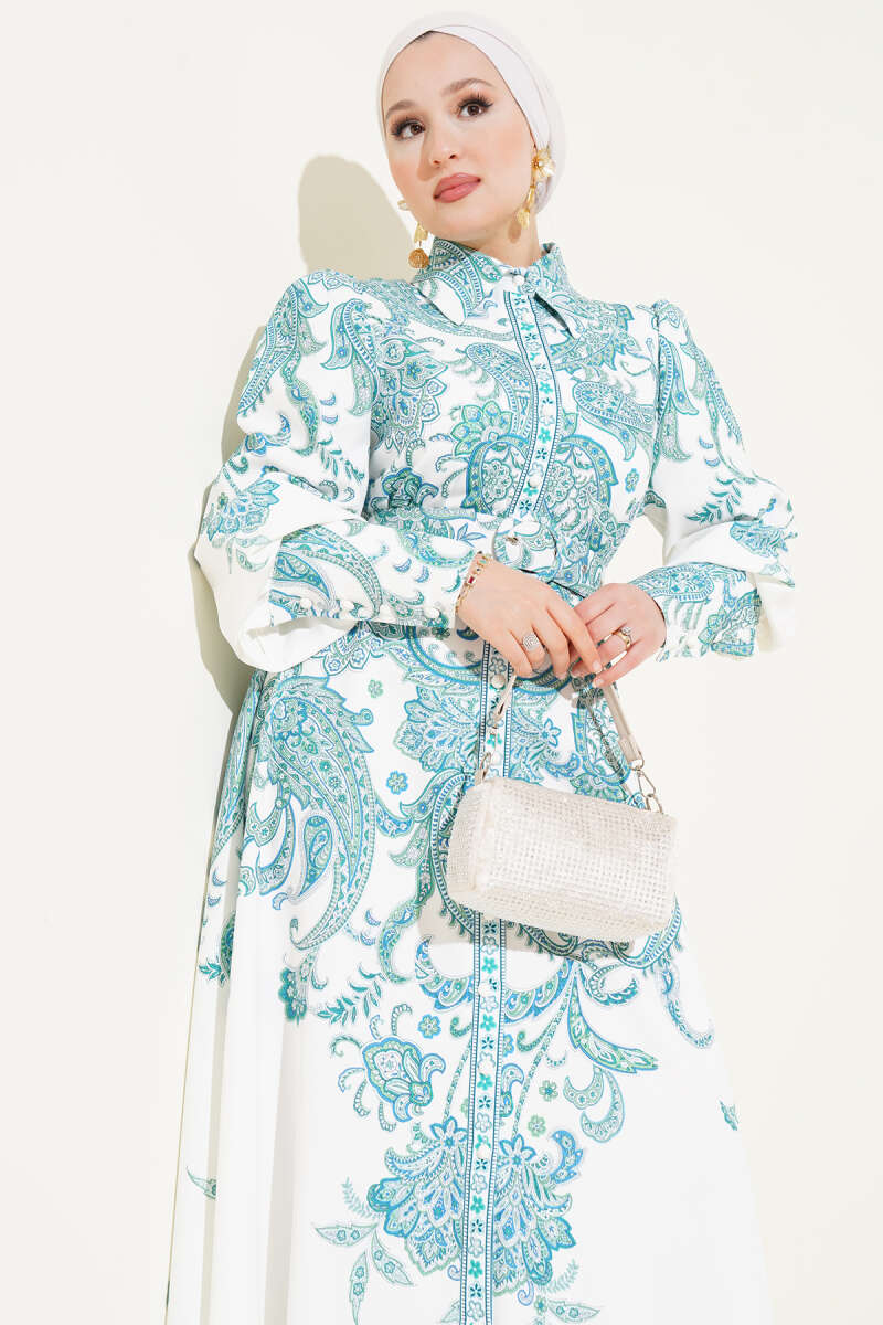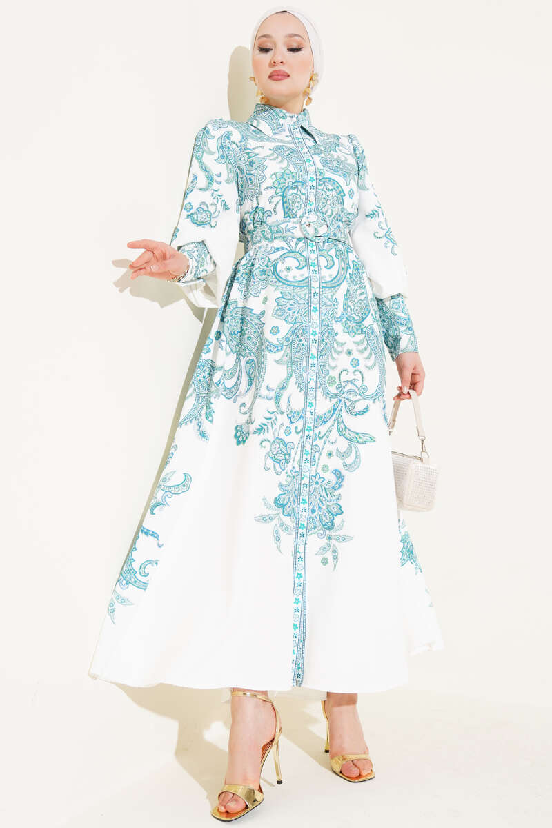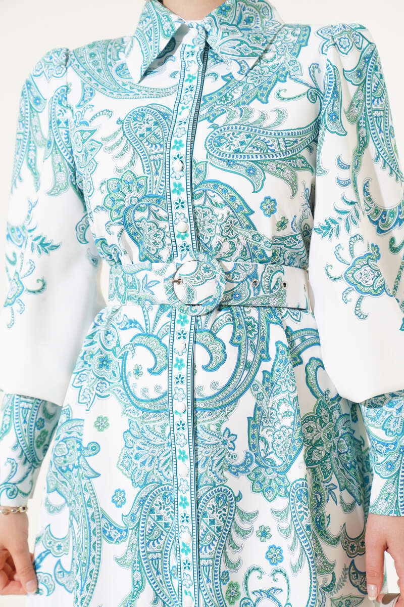 Boydan Düğmeli Etnik Desen Kemerli Elbise Yeşil